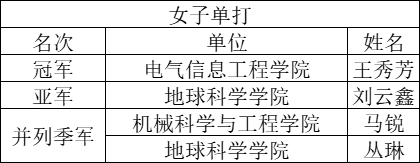 本次比赛共设男子单打、女子单打、男子双打、女子双打、混合双打五个项目,经过7天近160场的激烈比拼,最终地球科学学院于波获男子单打冠军,电气信息工程学院王秀芳获女子单打冠军,现代教育技术中心郭堂军、黄刚获男子双打冠军,地球科学学院丛琳、刘云鑫获女子双打冠军,电气信息工程学院王秀芳、刘伟获混合双打冠军。