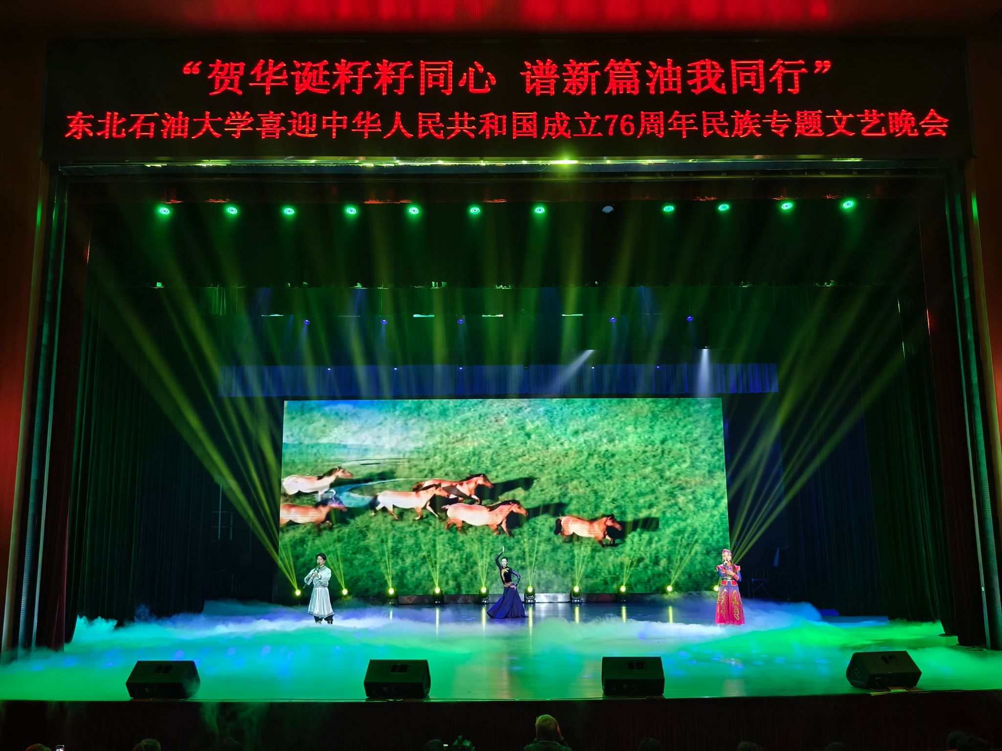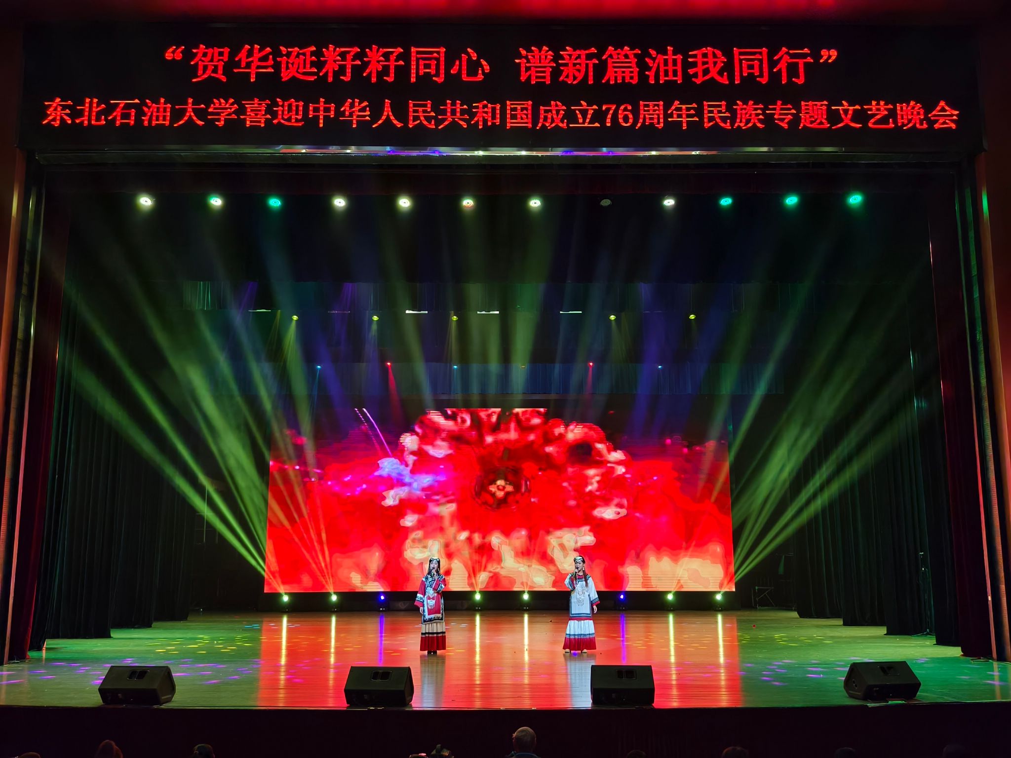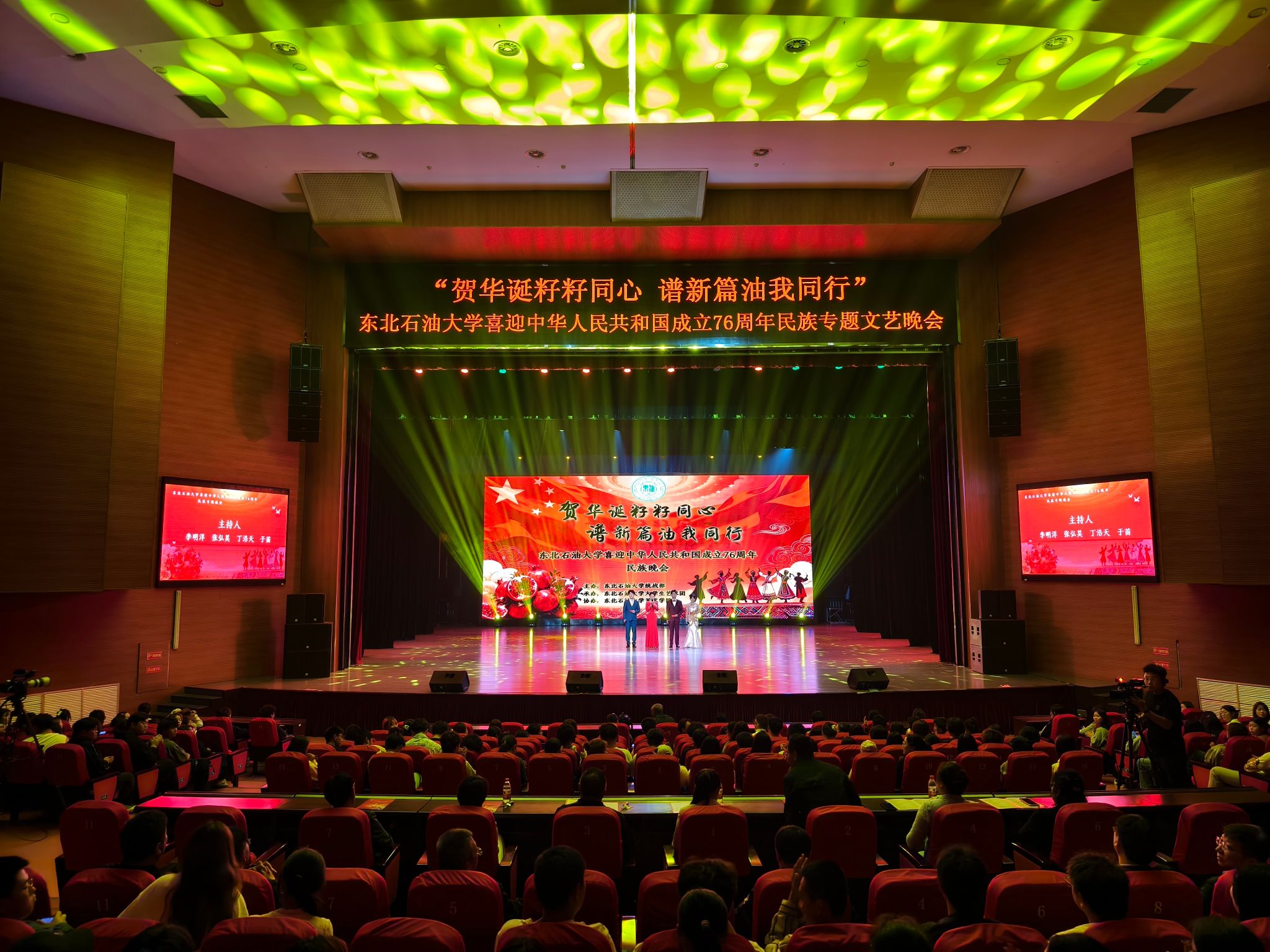 (通讯员 王书婷 记者/摄影 杨雨剑)为庆祝中华人民共和国成立76周年,深化民族团结进步教育,丰富“民族团结进步宣传月”活动内涵,9月27日晚,我校以“贺华诞籽籽同心 谱新篇油我同行”为主题,在音乐厅举办喜迎中华人民共和国成立76周年民族专题文艺晚会。校长董宏丽,校党委常委、组织部部长张智勇,校党委常委、宣传部部长徐清亮出席,校机关及二级学院相关负责人参加。本次晚会由党委统战部主办、大学生艺术团团总支承办、艺术学院协办,全校师生代表欢聚一堂,共赏民族文化盛宴,共话民族团结深情。