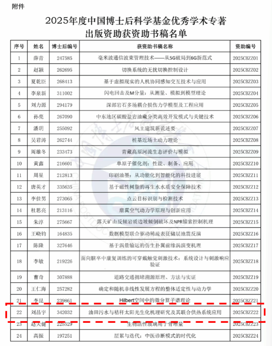 (通讯员 吴洋洋 记者 杨雨剑)近日,中国博士后科学基金会发布,根据《中国博士后科学基金资助规定》和《中国博士后科学基金资助指南(2025年度)》,经专家评审、选题论证及公示,决定对24部书稿给予中国博士后科学基金优秀学术专著出版资助。我校土木建筑工程学院建环系主任、寒区新能源利用与环境控制团队成员刘昌宇教授的专著《油田污水与秸秆太阳光生化机理研究及其联合供热系统应用》入选,是学校近年来在博士后学术成果转化与高水平专著出版领域又一项重要成果,为学校高质量发展提供了有效支撑。