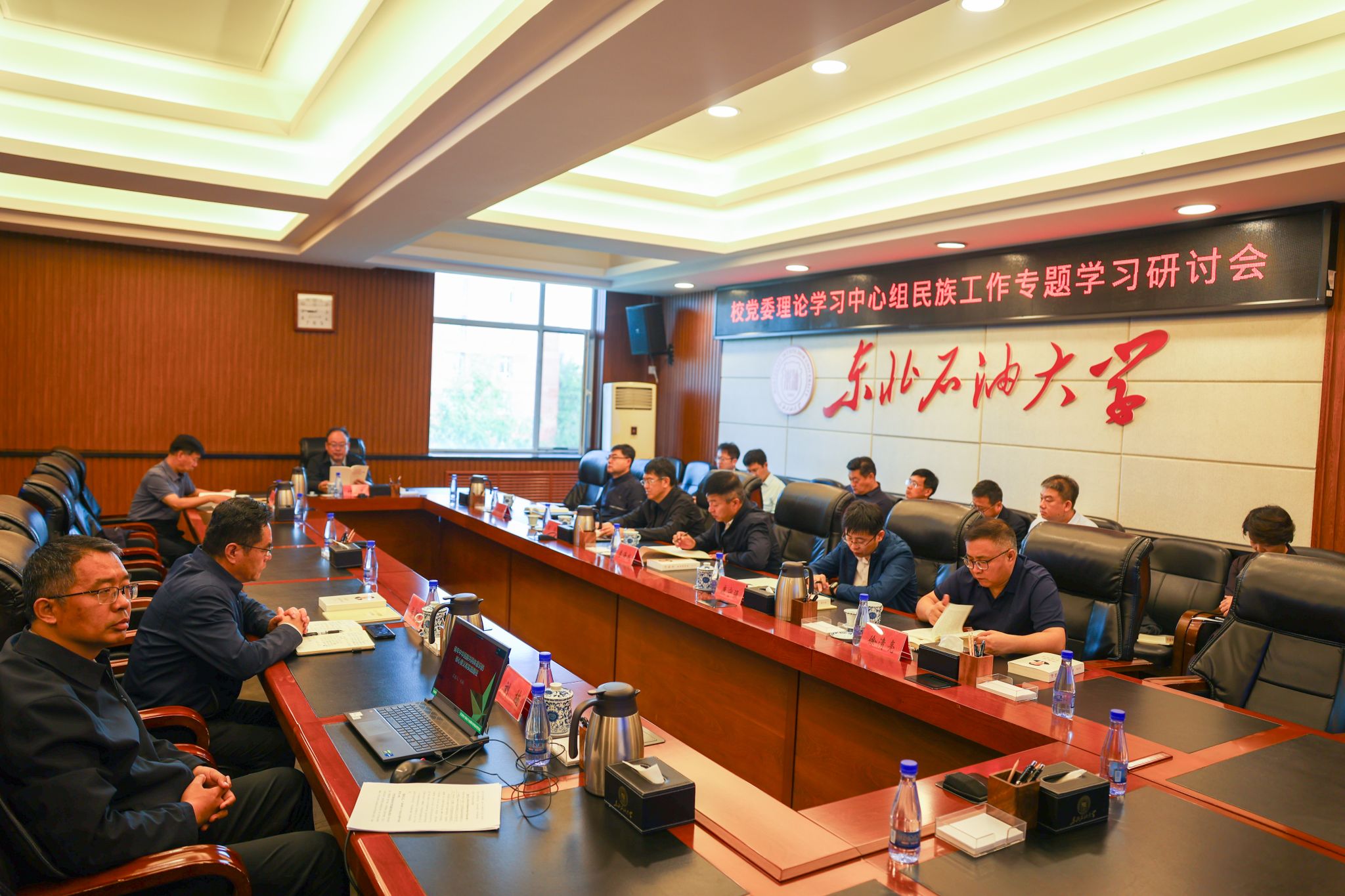付晓飞强调,要强化党对民族工作的全面领导,进一步健全和完善党委领导、统战部门统筹、基层党组织实施、师生全员参与的工作格局,巩固拓展学校民族工作国家级成果,引导全校广大师生员工不断提升关心、参与、推动、支持民族工作的思想自觉、政治自觉和行动自觉。要强化价值导向,坚持以社会主义核心价值观为主导,充分利用大庆精神育人红色资源,完善“教师立行-课堂主导-日常养成-文化感染-实践延伸-就业导向”大庆精神育人模式,共筑民族工作的精神家园。要强化宣传教育,开好《中华民族共同体概论》课程,组织好民族团结进步月系列活动,充分发挥“东油同心·石榴红”民族团结进步教育辅导员工作室和“石榴籽小屋”学生宿舍作用,打造“石榴园”强化民族团结进步的标识、文化和成果宣传展示,全面促进各民族师生交往交流交融。要强化人文关怀和管理,推进学业帮扶到位、心理援助到位、生活关爱到位、就业服务到位、管理服务到位和风险管控到位,推动各民族学生共同成长成才。