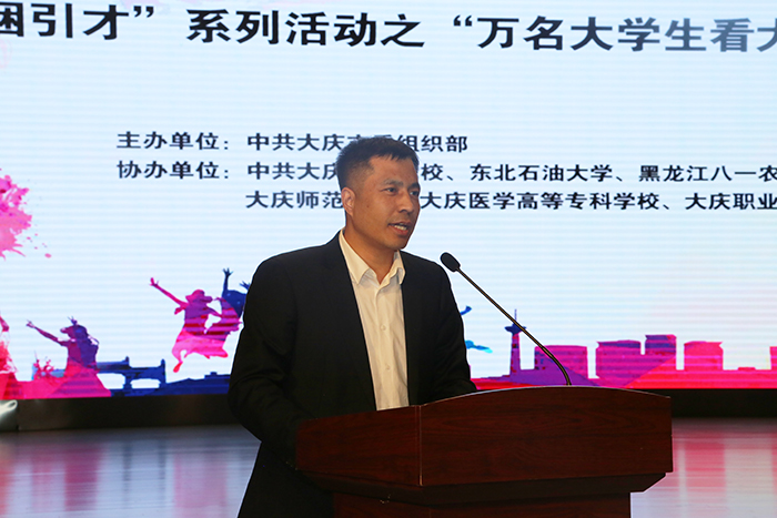 参观结束后,活动总结大会在我校音乐厅举行。市委常委、组织部部长韩辉,我校党委副书记刘景顺,哈尔滨医科大学大庆校区副校长宋印利,黑龙江八一农垦大学副校长于立河出席大会。会上,6所驻庆高校的师生代表分享了活动感悟;来自传统行业、新兴产业、市直机关、生产一线的优秀毕业生代表分享了在大庆工作的心路历程;我校校友、大庆黑糯米信息科技有限公司董事长曹洪彬代表优秀毕业生进行现场创业辅导;市委组织部对面向驻庆高校毕业生的“打捆引才”政策进行了详细介绍。