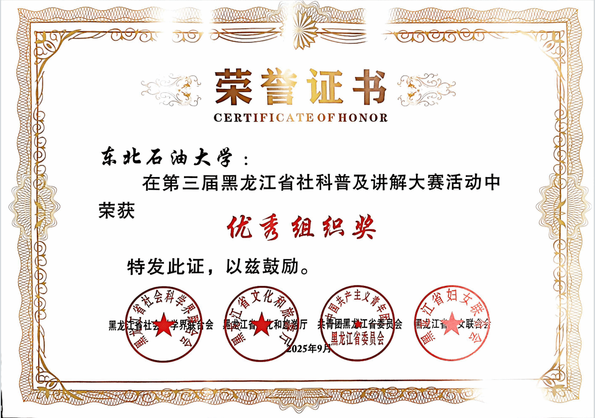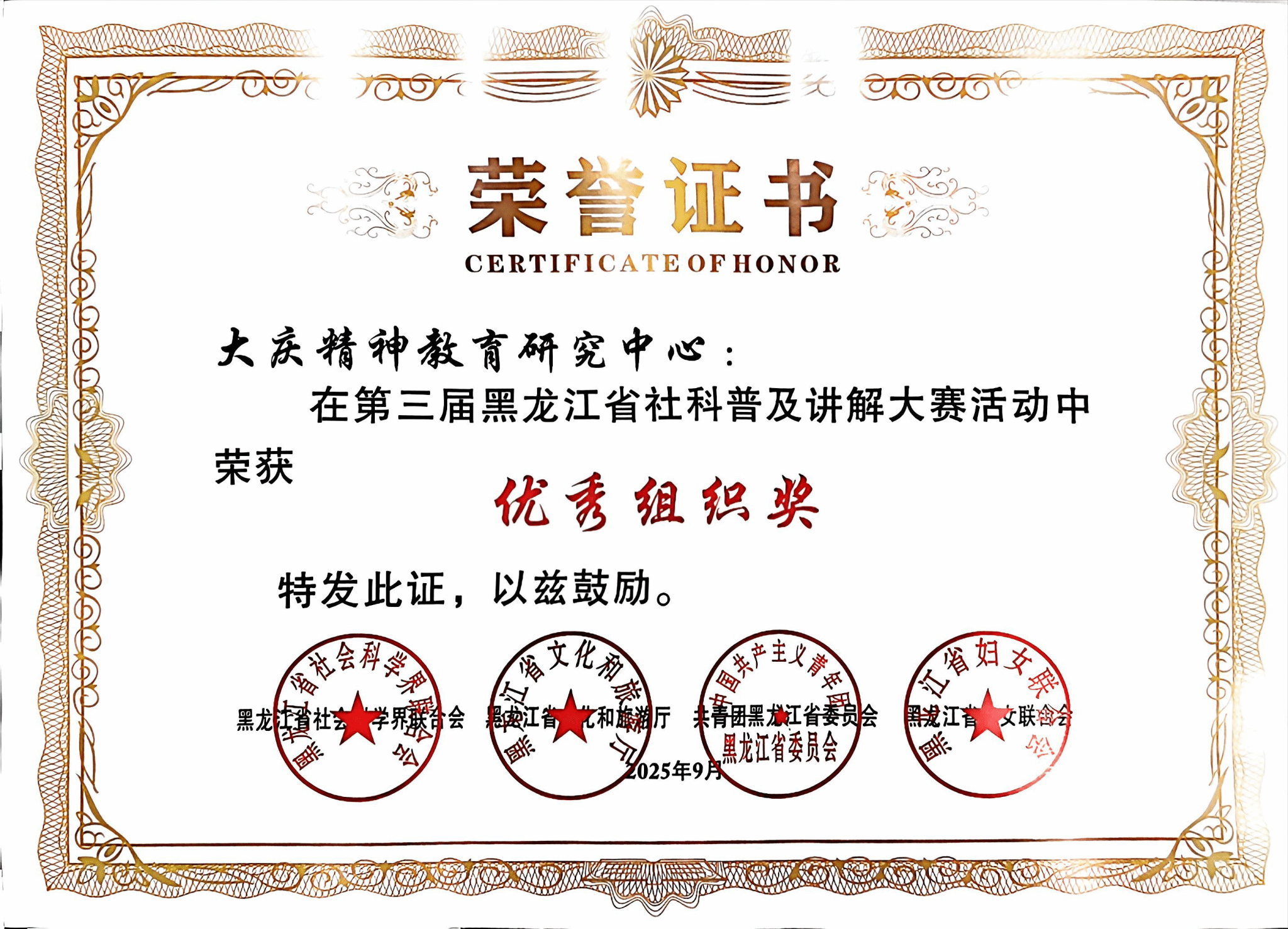 (通讯员 王宇轩 记者 胡玉喆)近日,由省社科联、省文旅厅、团省委、省妇联共同主办的第三届黑龙江省社科普及讲解大赛举办,我校大庆精神教育研究中心和马克思主义学院组成师生联队携手参加并获佳绩。大赛以“担负起新时代的文化使命”为主题,旨在深入学习贯彻习近平文化思想,赓续传承中华历史文脉,推动中华优秀传统文化创造性转化、创新性发展,为加快推进文化强省建设贡献力量。