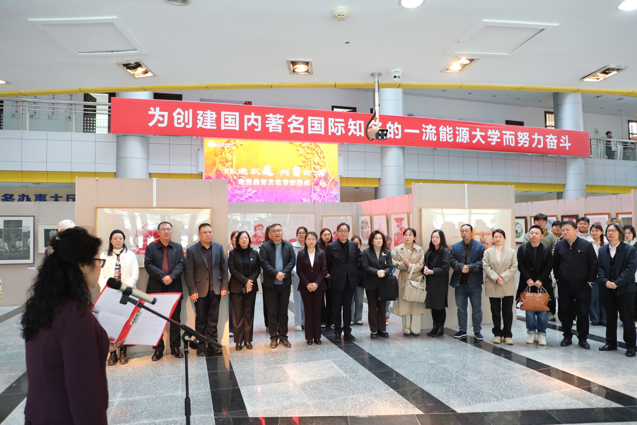 董宏丽致开幕辞。她强调了美育与文化传承在高校育人工作中的重要作用,并指出,东北石油大学始终以“五育并举”为指引,将大庆精神融入美育全过程,显著提升了学生的审美情趣与人文素养,实现了多样化全覆盖具有非遗特色的东油美育格局,推进了美育校园文化建设。
