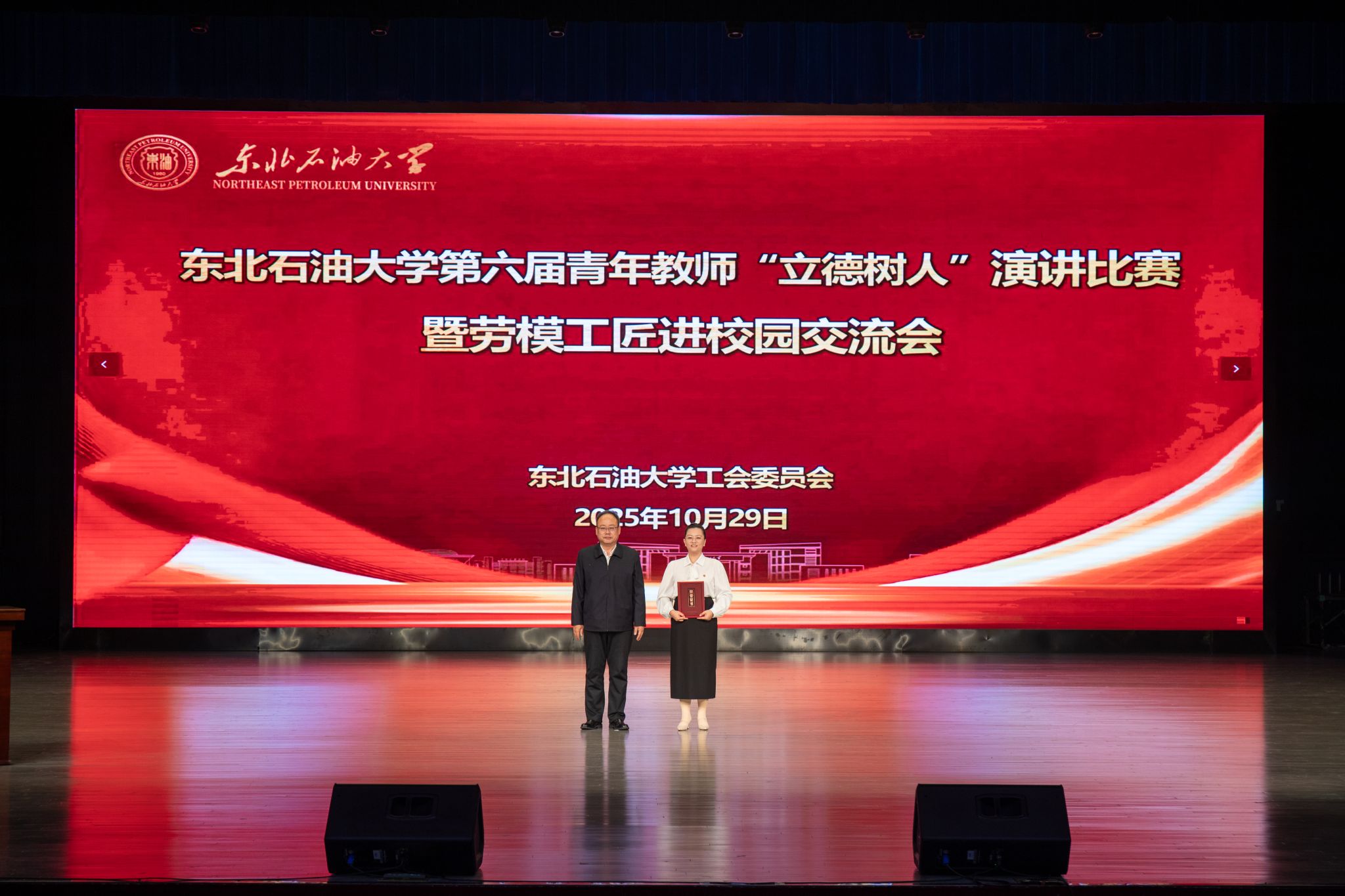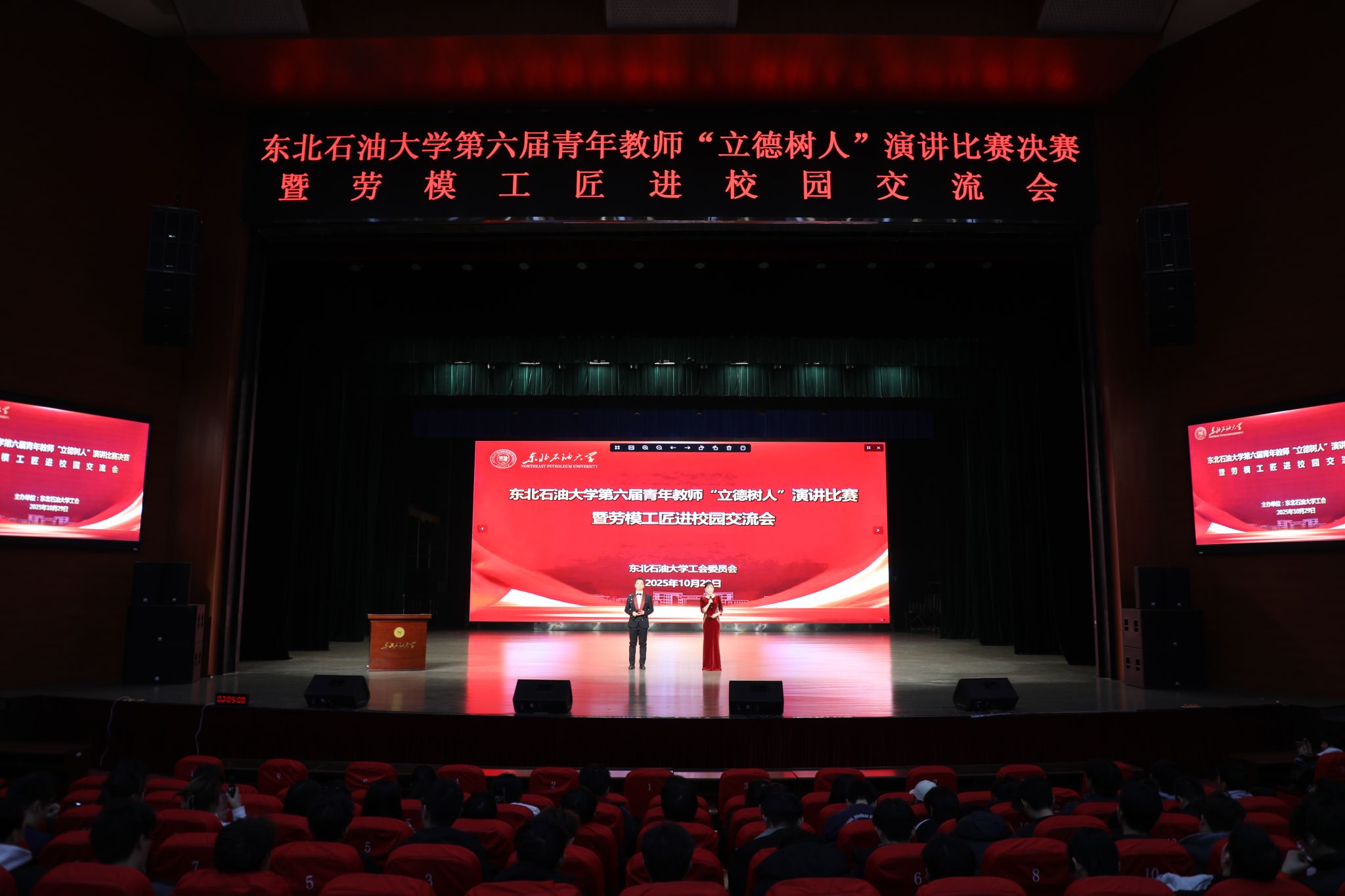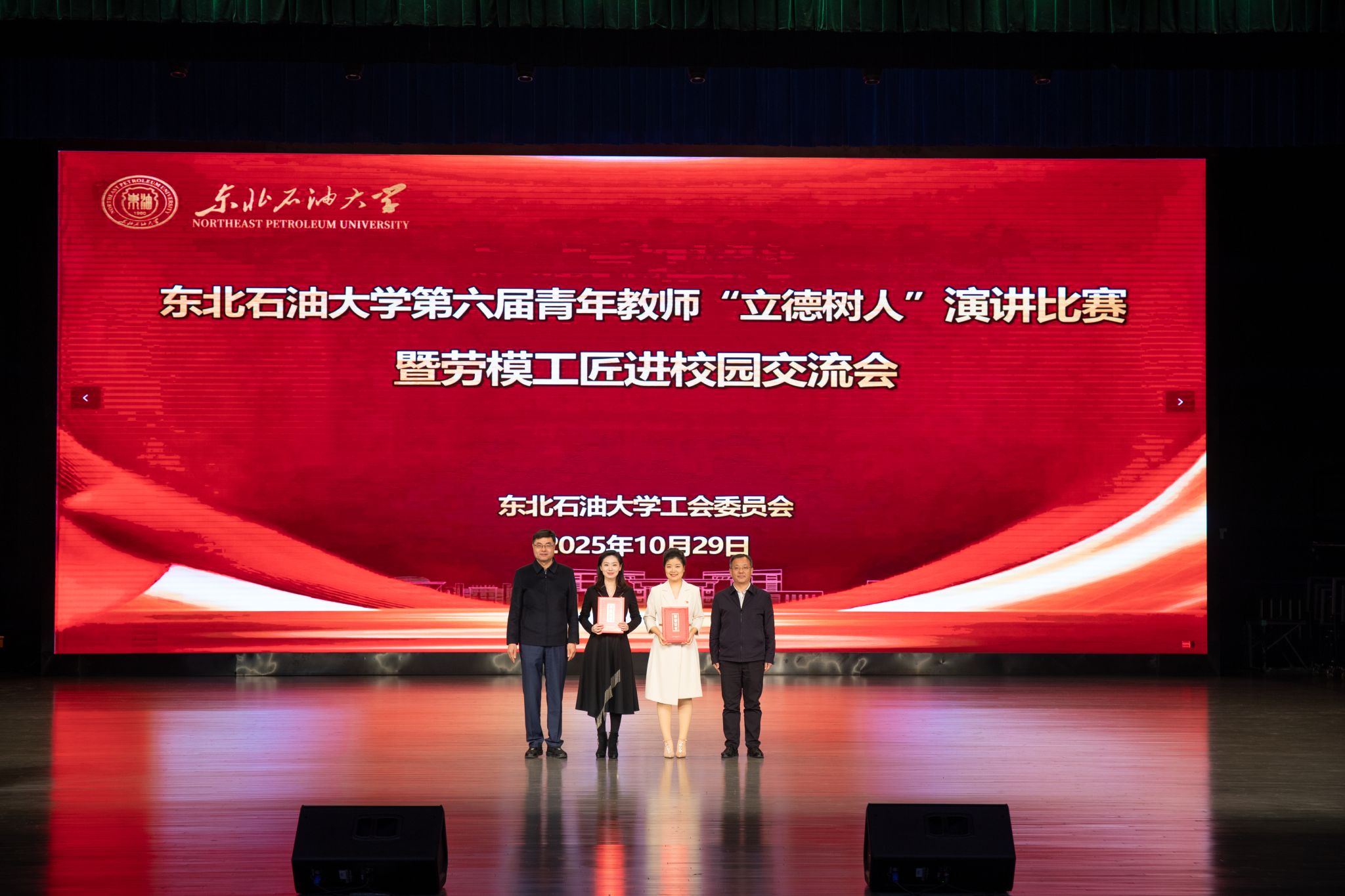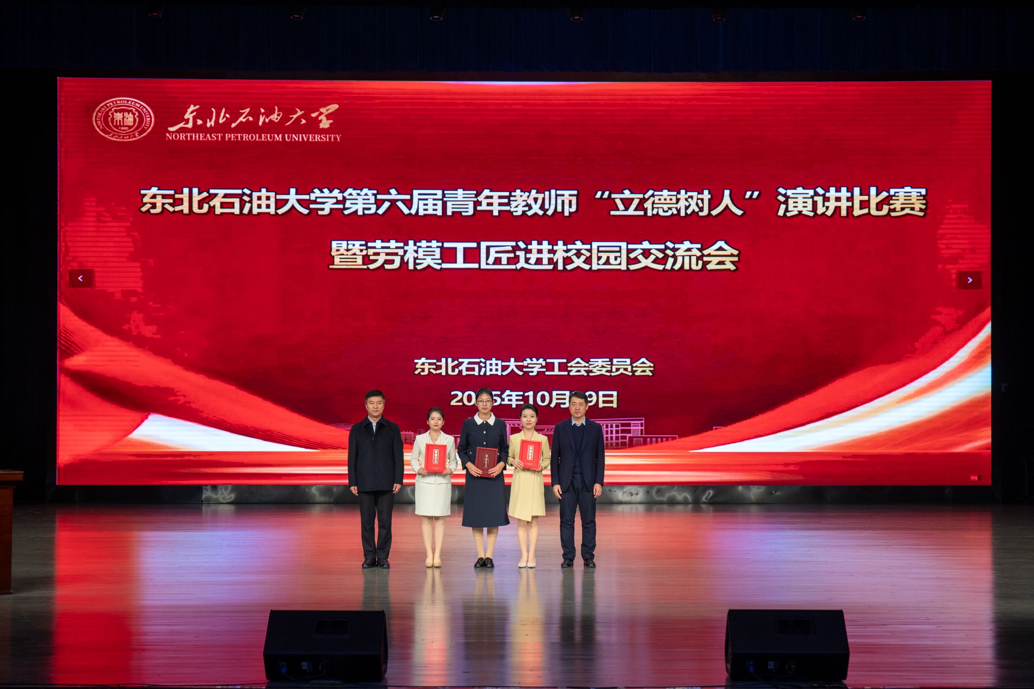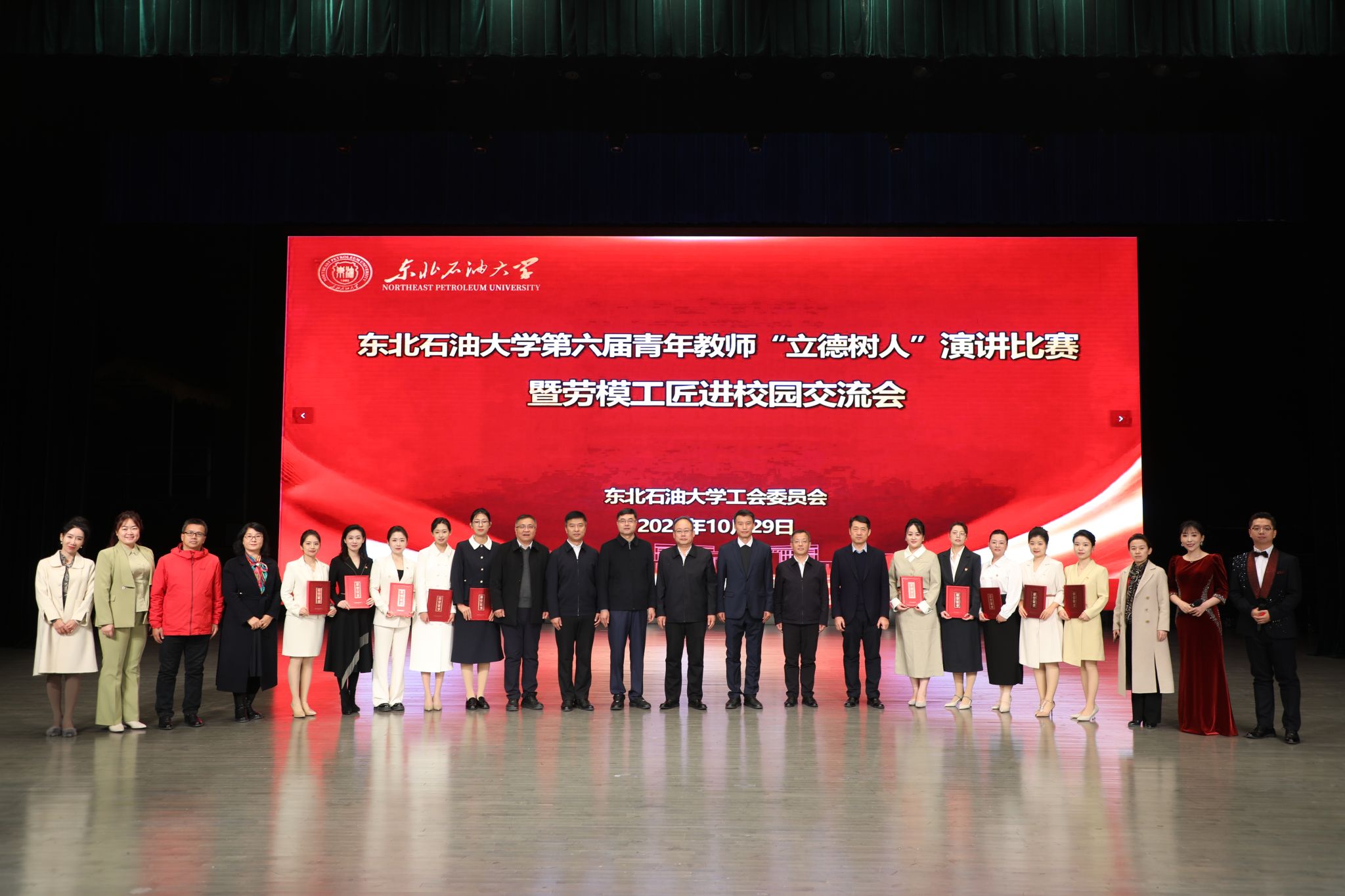 (通讯员 张昊 记者/摄影 辛纪元 杨雨剑)10月29日下午,第六届青年教师“立德树人”演讲比赛决赛暨劳模工匠进校园交流会在音乐厅举行。校党委班子成员付晓飞、于长青、李伟、杨二龙、李海成、王志磊、徐清亮出席。校工会副主席姜海燕,大庆精神教育研究中心主任李万鹰,校团委书记施洋,人事处副处长、党委教师工作部副部长马洪杰,人文科学学院副院长陈竞飞担任比赛评委。各二级单位相关负责人及师生代表参加。