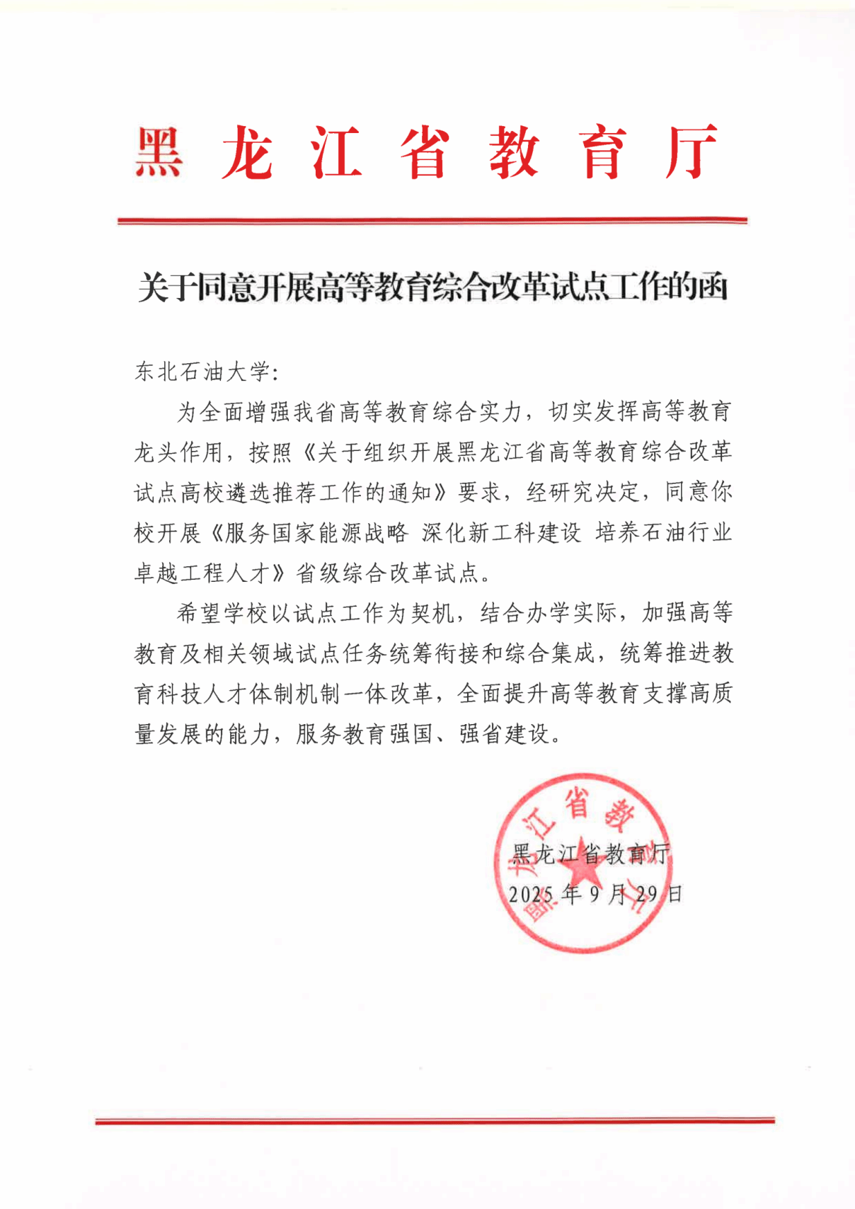 (通讯员 朱雨鑫 记者 杨雨剑)近日,黑龙江省教育厅印发通知,同意我校开展“服务国家能源战略 深化新工科建设 培养石油行业卓越工程人才”省级综合改革试点。