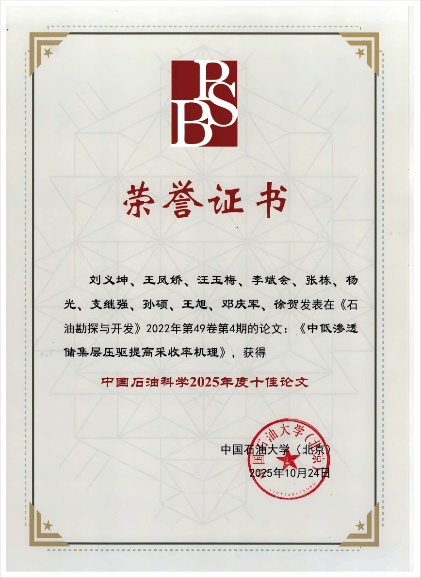 (通讯员 谢坤 记者 于千惠)10月24日,由中国石油大学(北京)组织开展的“中国石油科学2025年度十佳论文”评选结果揭晓,我校为第一完成单位,第一作者刘义坤教授、通讯作者王凤娇教授发表在《石油勘探与开发》2022年第49卷第4期的论文“中低渗透储集层压驱提高采收率机理”入选“2025年度中国石油科学十佳论文”。中国石油大学(北京)校长金衍和《石油勘探与开发》期刊主编高兴军共同为刘义坤颁奖,王凤娇作为获奖代表发言。