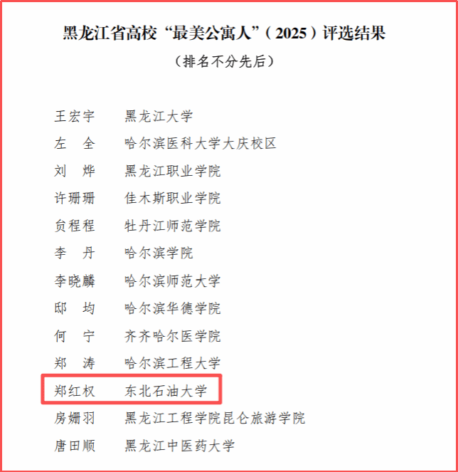(通讯员 赵瑛杰 记者 周宏)近日,黑龙江省教育后勤管理协会学生公寓管理专业委员会发布《关于黑龙江省高校“最美公寓人”(2025)评选结果的公示》,经过高校推荐、资格审核、专家评选等多环节严格遴选,我校教工郑红权凭借扎实的工作作风、优质的服务水平与突出的工作成效,成功获评黑龙江省高校“最美公寓人”(2025)荣誉称号,充分展现了我校公寓管理服务队伍的良好风貌。
