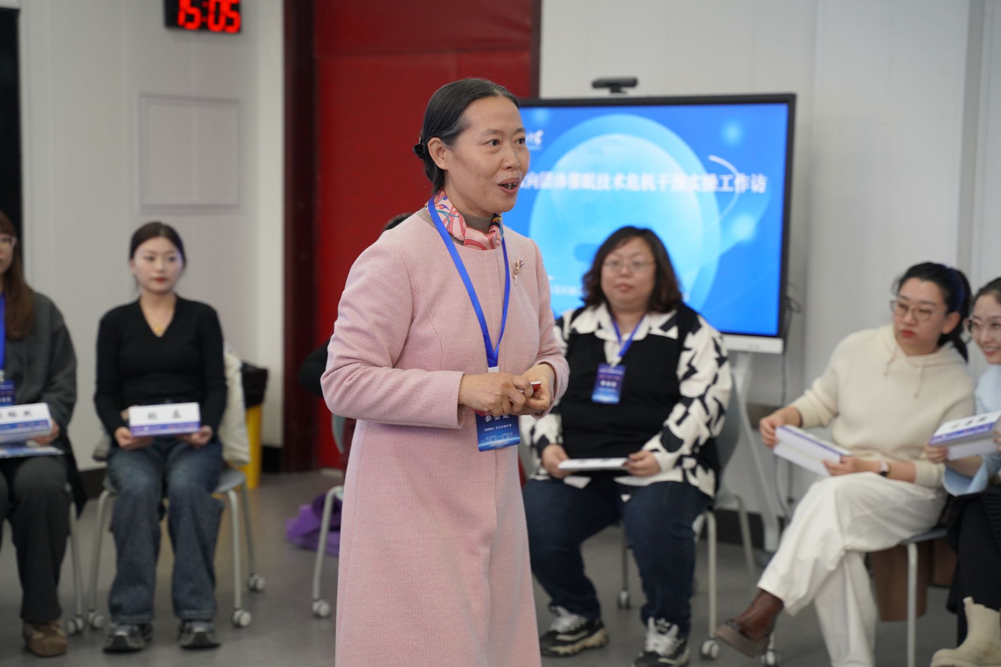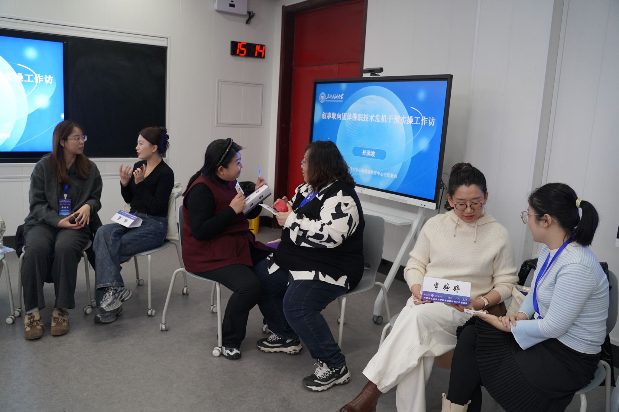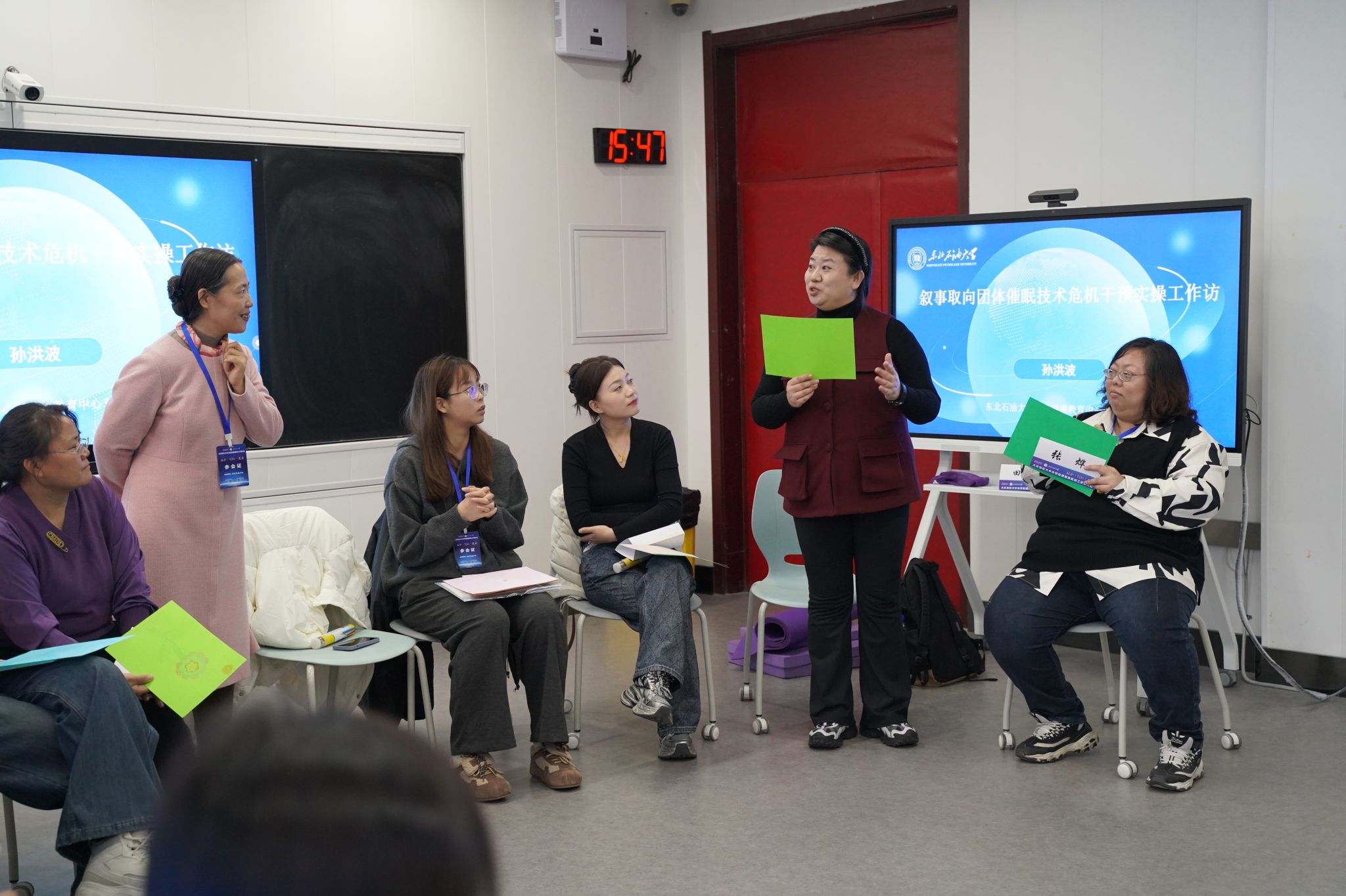 在实践环节,我校心理健康教育专职教师孙洪波作叙事取向团体催眠技术危机干预实操工作坊,引导与会教师通过非言语表达释放情绪压力、促进自我觉察。