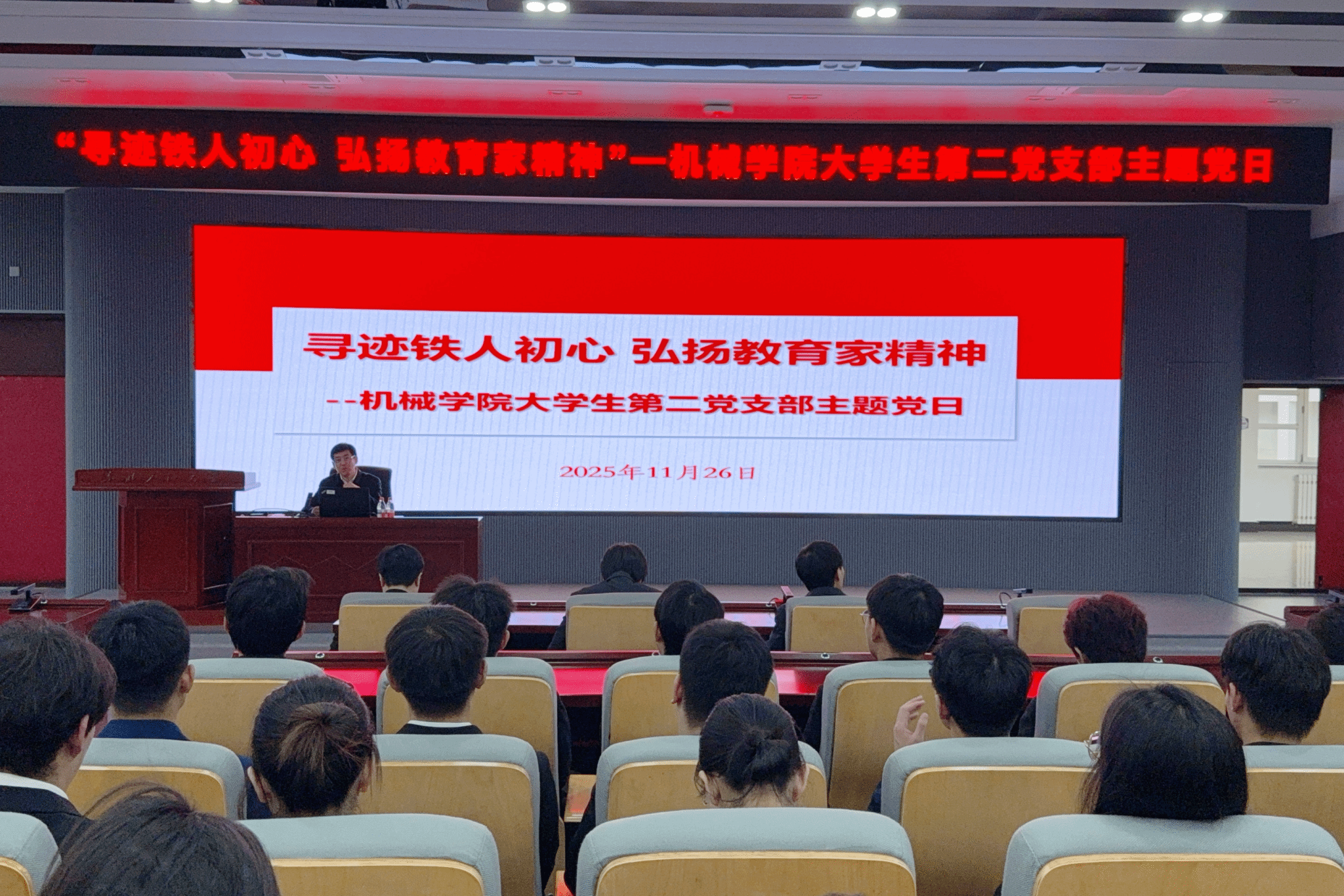 (通讯员 卢梦媚 记者 于千惠)为深入学习贯彻习近平总书记关于教育的重要论述,大力弘扬新时代教育家精神,传承铁人基因,强化党员身份意识与责任担当,11月26日,机械科学与工程学院大学生第二党支部开展“寻迹铁人初心 弘扬教育家精神”主题党日活动。副校长李伟、机械科学与工程学院相关负责人参加。
