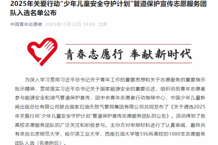 (记者 胡玉喆)近日,团中央青年志愿者行动指导中心、中国少年儿童新闻出版总社有限公司、国家石油天然气管网集团有限公司联合公布2025年“少年儿童安全守护计划”管道保护宣传志愿服务团队名单,人文科学学院“重走铁人路”铁人精神宣讲团成功入选。