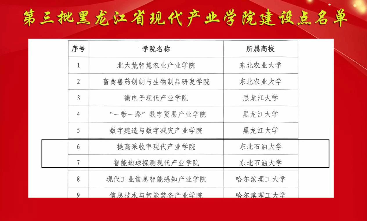 (通讯员 鲁天舒 记者 周宏)11月26日,黑龙江省教育厅公布第三批黑龙江省现代产业学院建设点名单,全省共有46个产业学院获批。我校“提高采收率现代产业学院”与“智能地球探测现代产业学院”入选。