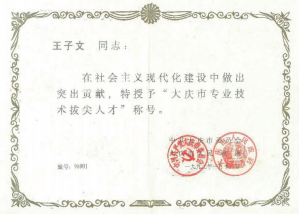 1991年王子文获得“大庆市专业技术拔尖人才”称号