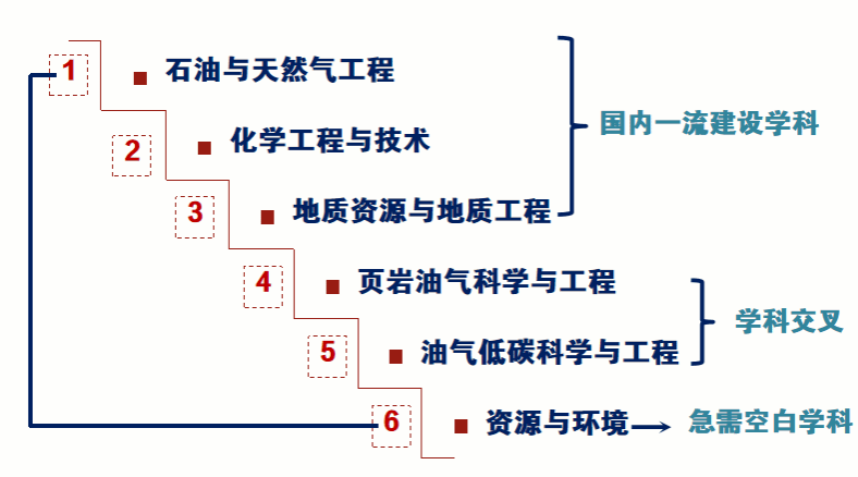 学科水平实现跨越式提升,优势学科引领作用凸显。石油与天然气工程在第五轮全国学科评估中实现从B类到A类的历史性跨越。新增低空技术与工程、新能源与材料工程、页岩油气科学与工程、碳储科学与工程4个自主设置交叉学科,布局建设“页岩油气科学与工程”“油气低碳科学与工程”学科交叉培育学科和“资源与环境”急需空白学科。工程学、化学、地球科学、材料科学进入ESI全球前1%学科。