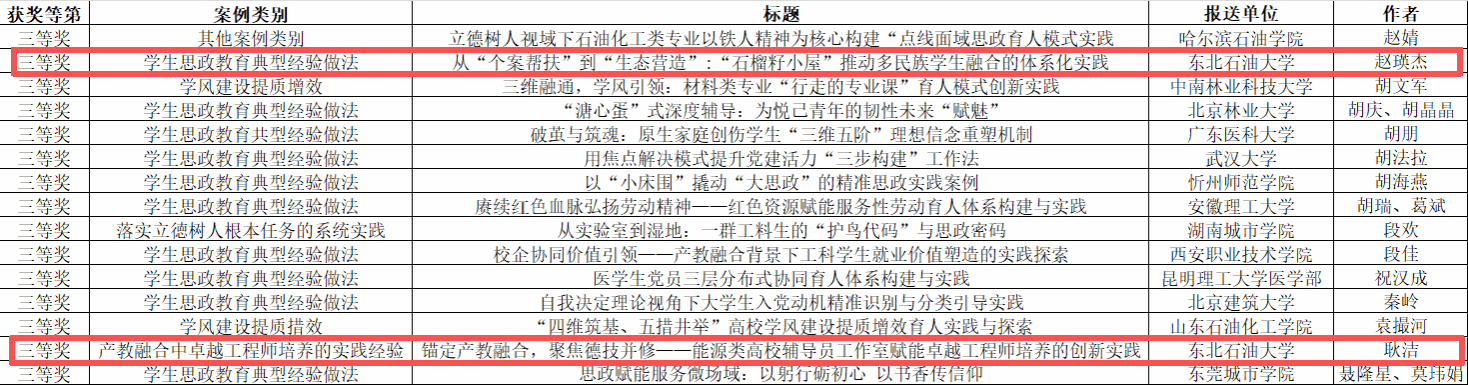 (通讯员 安子怡 记者 周宏)日前,教育部高校思想政治工作队伍培训研修中心(南昌大学)公布2026年全国高校学生思想政治工作优秀案例征集活动获奖名单。学生工作部学生思想教育科科长赵瑛杰、土木建筑工程学院团委副书记耿洁分别凭借《从“个案帮扶”到“生态营造”:“石榴籽小屋”推动多民族学生融合的体系化实践》与《锚定产教融合,聚焦德技并修——能源类高校辅导员工作室赋能卓越工程师培养的创新实践》两篇案例荣获三等奖。