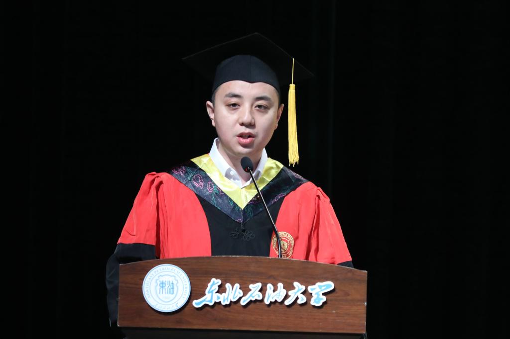 石油工程学院青年教师谢坤代表全体教师为毕业生送上祝福。他寄语全体毕业生要坚定为党为国为民初心,牢记人生奋斗使命,为民族复兴伟业贡献青春力量;要强身健体,读书修心,践行大庆精神铁人精神,勇于担当、奋力前行,做有志气的中国人、有骨气的石油人、有底气的东油人。