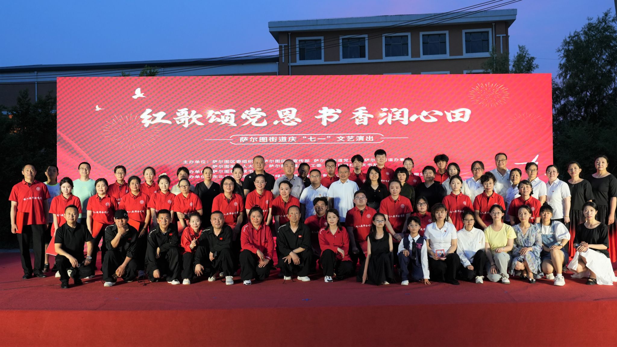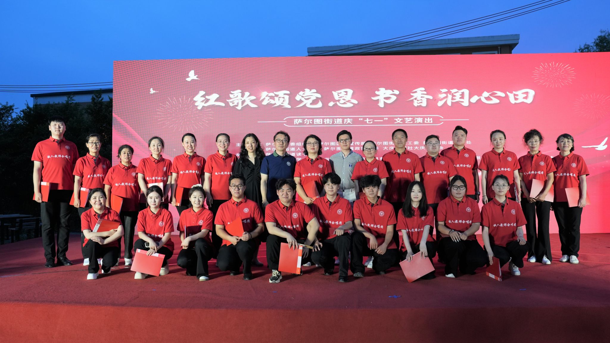 6月27日晚,合唱团应邀参加“红歌颂党恩 书香润心田”萨尔图街道庆“七一”文艺演出,在萨尔图街道文化广场演唱了《百年荣光》《爱我中华》《踏着铁人脚步走》三首歌曲,受到萨尔图街道领导和群众们的欢迎。合唱团团员、校工会副主席姜海燕还与大庆市总工会教科文卫体工会主席李志勇联袂朗诵了姜海燕的原创诗歌《建党百年礼赞》,为晚会增添了亮色。