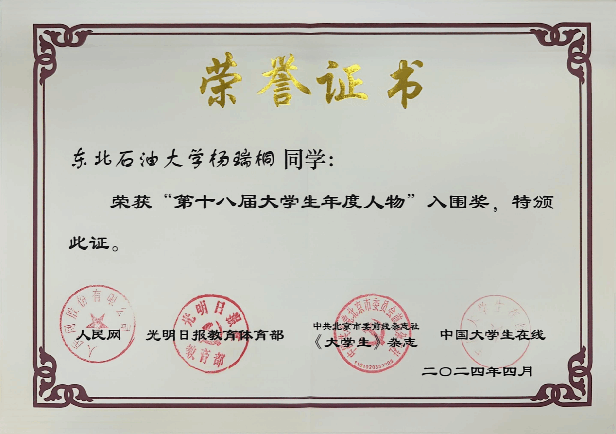 杨瑞桐现为我校石油与天然气工程学科在站博士后,是我校土木建筑工程学院自主培养的本硕博连读青年骨干教师。曾获“中国大学生自强之星”、中国国际“互联网+”大赛铜奖、“人民网奖学金”等60余项奖励。