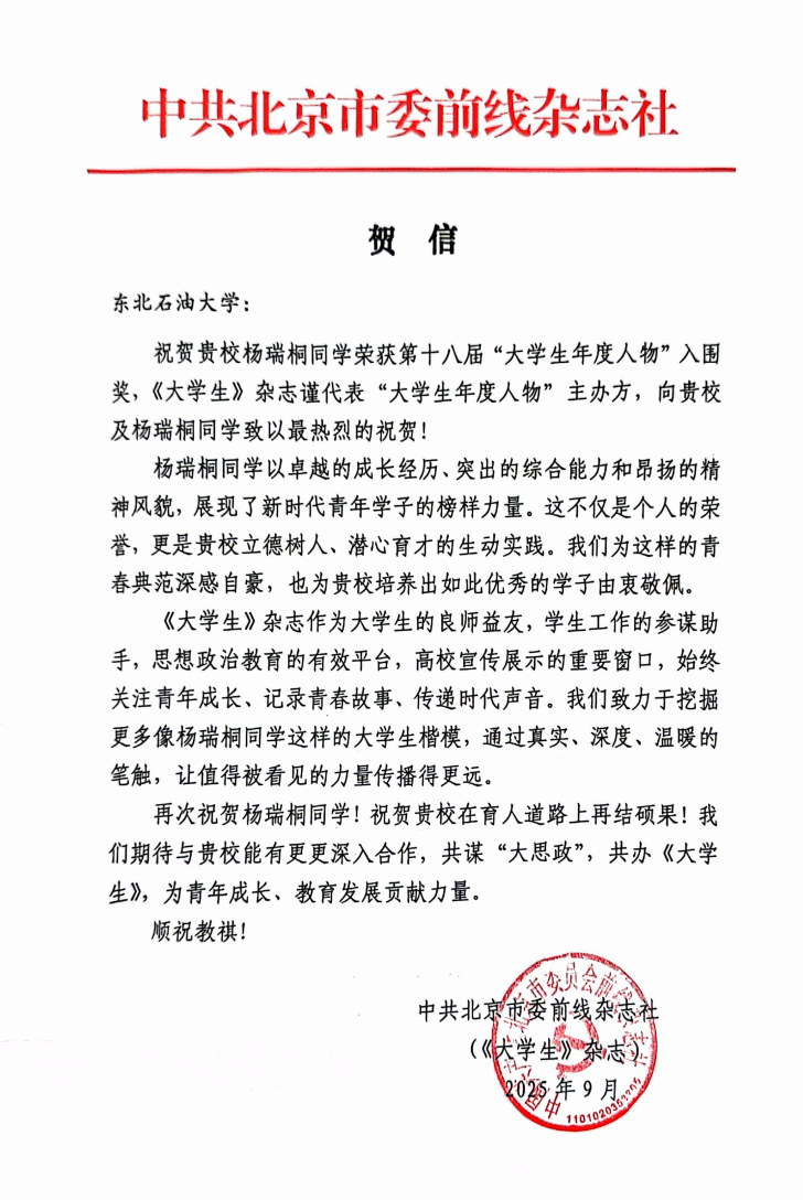 (通讯员 王媛媛 记者 杨雨剑)日前,我校收到中共北京市委前线杂志社(《大学生》杂志)发来的贺信,向我校及学子杨瑞桐表示热烈祝贺。贺信特别对我校立德树人、潜心育才的办学成效给予充分肯定。此前在由教育部、人民日报社共同指导,人民网、光明日报教育体育部、《大学生》杂志和中国大学生在线联合主办的第十八届“大学生年度人物”推选展示活动中,杨瑞桐获评入围奖。