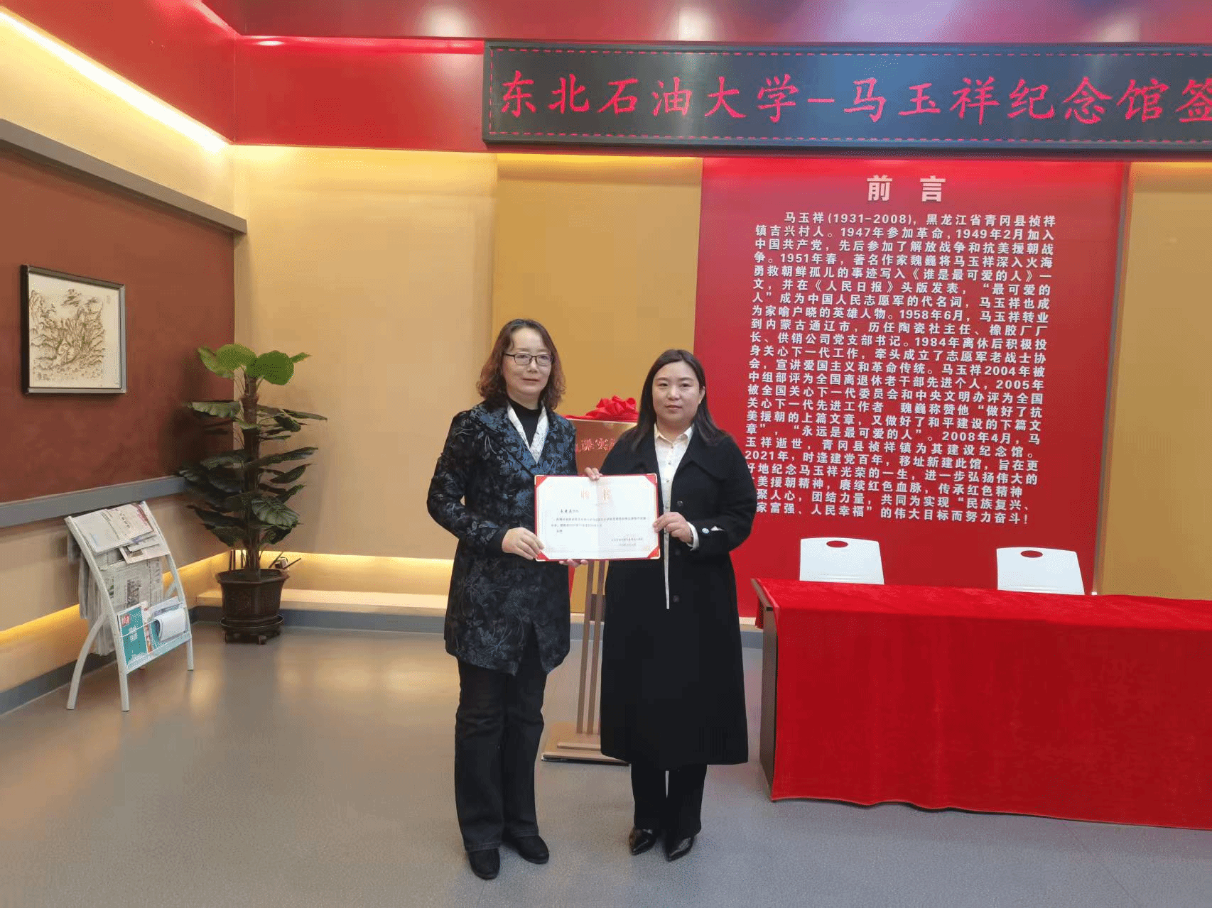 签约仪式现场,王鹤岩聘请青冈县马玉祥纪念馆馆长王晓庆、副馆长白玛央金担任我校思政课实践导师并颁发聘书。签约仪式后,白玛央金引领众人寻迹“最可爱的人”——马玉祥老人。白玛央金通过陈列的实物、图片、文字、主题雕塑及3D复原的场景再现了马玉祥在松骨峰战斗、勇救朝鲜儿童的光辉事迹。马玉祥荣归转业地方后,依然隐姓埋名支援边疆、守卫祖国海空。中国当代作家、诗人魏巍称赞他“做好了抗美援朝的上篇文章,又做好了和平建设的下篇文章,永远是最可爱的人”。