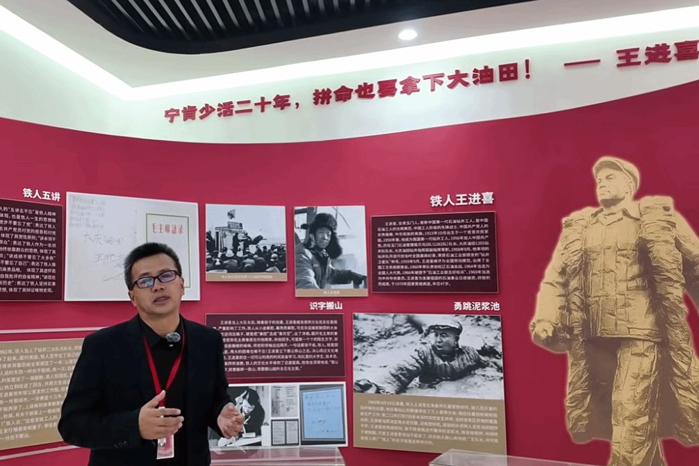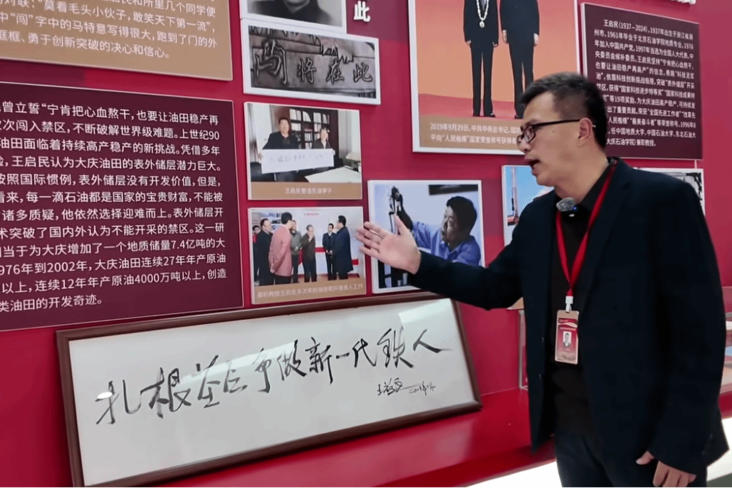 “大家现在看到的,是新时期铁人王启民亲笔题写的‘扎根基层争做新一代铁人’。这短短十一个字,既承载着‘宁肯把心血熬干,也要让油田稳产再高产’的铿锵决心,更延续了一辈子为国家多找油、多产油的精神血脉……”直播镜头下,李万鹰站在“铁人事迹展区”前,以展区内的历史实物、珍贵老照片为依托,融入自身对大庆精神(铁人精神)的深耕研究,生动铺展每一代“铁人”的奋斗长卷:从“铁人”王进喜带领1205钻井队战天斗地、艰苦创业的初创岁月,到“新时期铁人”王启民扎根油田、攻坚克难“为稳产找油”的科技攻关之路,再到“大庆新铁人”李新民勇担使命、“把铁人旗帜插向海外”的新时代担当……李万鹰将每一段历史、每一个故事讲得绘声绘色,将抽象精神概念转化为具象表达,让大庆精神(铁人精神)的独特魅力跃然眼前。