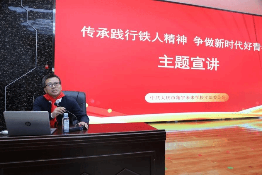 为持续深化共建成果,将大庆精神(铁人精神)的种子播撒到更广阔的基础教育土壤中,11月4日,李万鹰一行走进翔宇未来学校,面向教师党员、入党积极分子、团员,学生团员、少先队员代表开展了以“传承践行铁人精神,争做新时代好青年”为主题的宣讲。李万鹰从铁人精神的内涵和铁人精神在新时代的传承两个方面进行讲述,对包括“为国分忧,为民族争气”的爱国主义精神,“宁肯少活二十年,拼命也要拿下大油田”的忘我拼搏精神,“有条件要上,没有条件创造条件也要上”的艰苦奋斗精神,“干工作要经得起子孙万代检查”“为革命练一身硬功夫、真本事”的科学求实精神,“甘愿为党和人民当一辈子老黄牛”的无私奉献精神在内的铁人精神内涵进行解读。李万鹰指出,新时代传承大庆精神(铁人精神),要弘扬伟大创造精神、伟大奋斗精神、伟大团结精神、伟大梦想精神。感悟交流环节中,师生代表踊跃发言,表示通过此次学习深刻领会了铁人精神的时代内涵,将把奋斗担当融入未来的教学与学习中,以实际行动让铁人精神落地生根。交流后,全场齐唱《踏着铁人脚步走》,歌声中满含传承精神、勇担使命的坚定信念,激昂的旋律将现场气氛推向高潮。