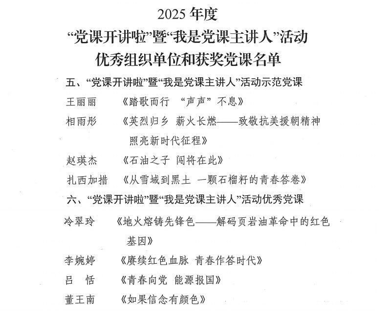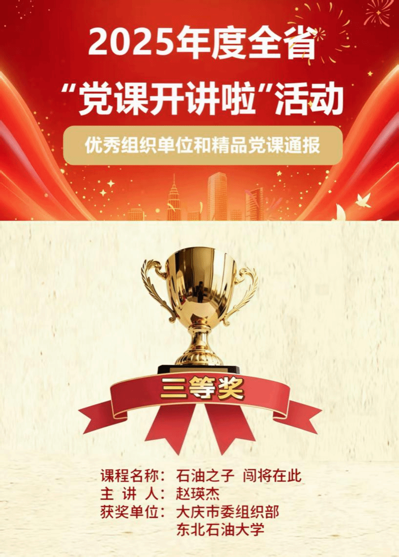大庆市委组织部通报了2025年度大庆市“党课开讲啦”暨“我是党课主讲人”活动优秀组织单位和获奖党课,赵瑛杰的党课作品获“示范党课”荣誉,马克思主义学院副院长冷翠玲、计算机与信息技术学院大学生第二党支部书记李婉婷、人文科学学院大学生第一党支部书记董王南、石油工程学院油气田开发工程研究生第二党支部书记吕恬的党课作品获“优秀党课”荣誉。