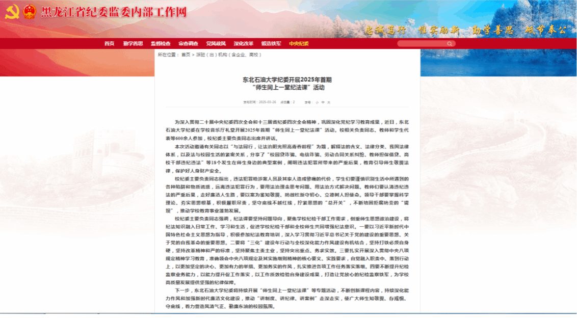 学校纪委坚持运用新媒体传播手段,打造全方位的廉洁文化传播矩阵,进一步增强廉洁文化辐射力、感召力和持久力。联合党委宣传部,精心打造学校官方网站廉洁文化专栏,将其作为传播廉洁理念、弘扬清风正气的核心线上阵地,同步依托学校官方微信公众号等新媒体平台,构建立体化传播矩阵,围绕全面从严治党最新部署要求、新时代廉洁文化建设、新时代家风建设典型事迹等核心主题,累计推送系列文章40余篇。拓展对外宣传新渠道,中央纪委国家监委、黑龙江省纪委监委、黑龙江广播电视台等主流媒体报道学校以廉洁文化育人、涵养风清气正校园生态的生动实践。紧扣“五一”“十一”“中秋”“元旦”等法定节假日,建立“节点预警+精准推送”廉洁提示机制。通过学校官方网站、全校二级纪检监察机构工作群等渠道,面向全校教职工下发廉洁提示,明确“红线”“底线”,以常态化、精准化的节点提醒,抓早抓小、防微杜渐,持续拧紧师生廉洁自律“发条”,筑牢拒腐防变思想防线。