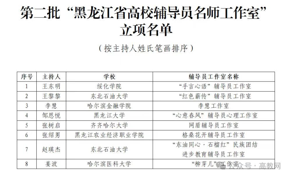 (通讯员 刘思宇 记者 周宏)1月20日,黑龙江省教育厅发布《第二批“黑龙江省高校辅导员名师工作室培育建设项目”验收结果的公示》。经现场答辩、专家评审等环节,我校“红色薪传”辅导员工作室(主持人:王黎黎)、“东油同心·石榴红”民族团结进步教育辅导员工作室(主持人:赵瑛杰)顺利通过验收,正式获批认定为第二批“黑龙江省高校辅导员名师工作室”。