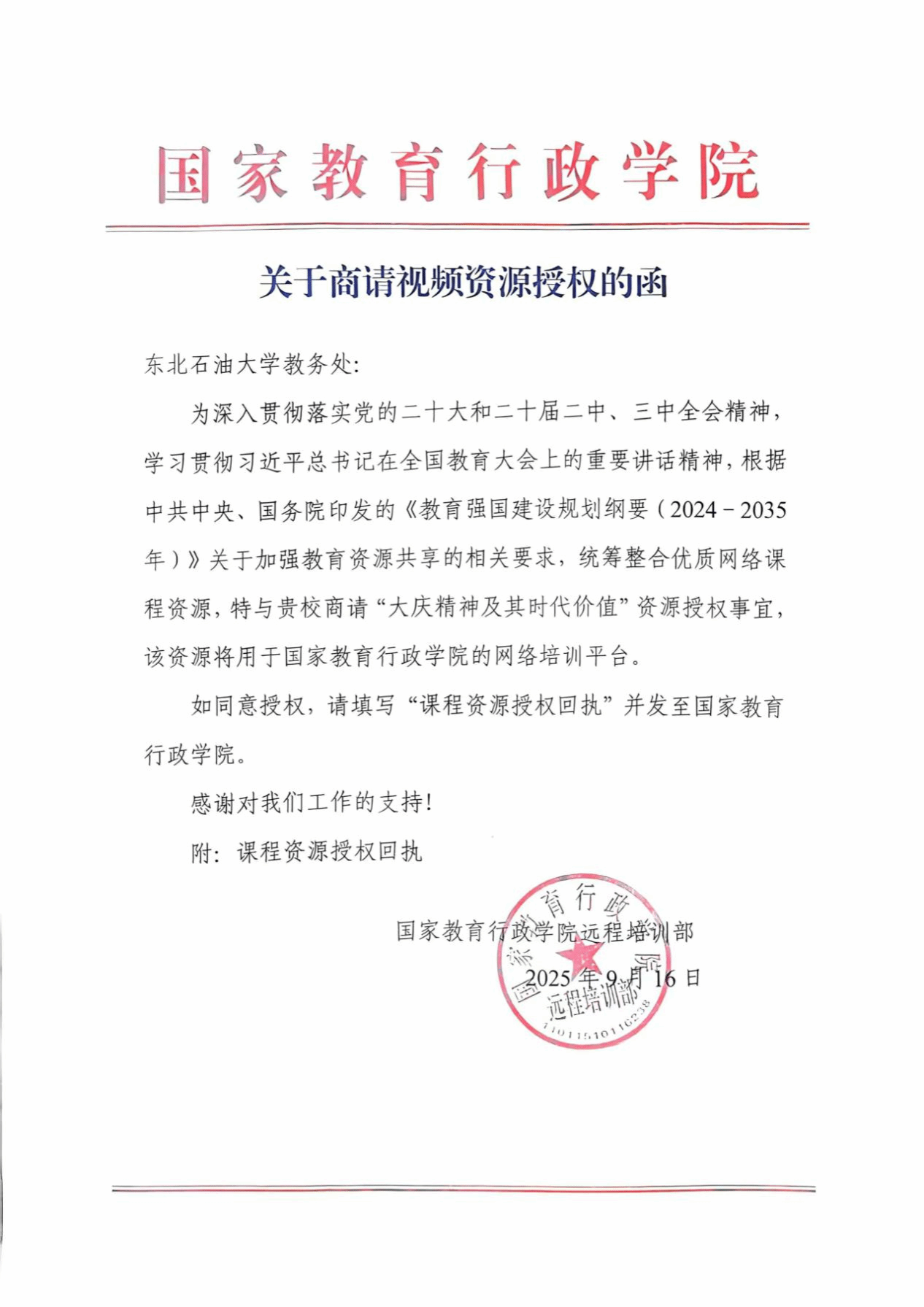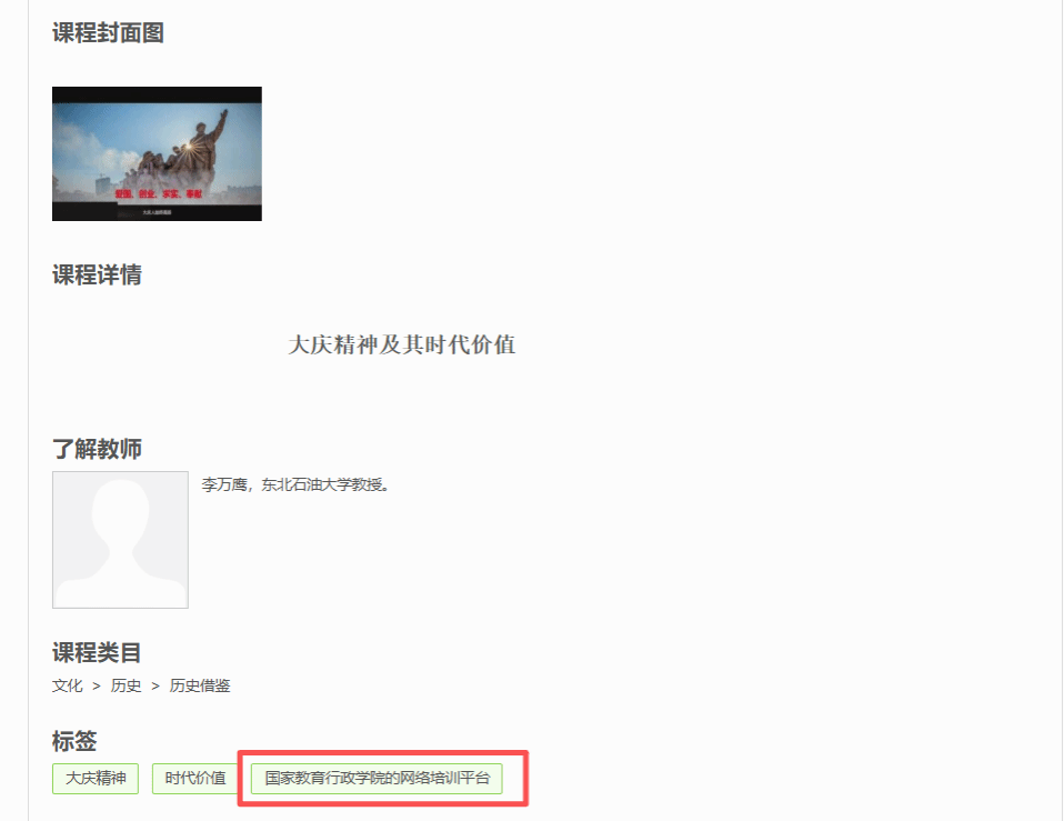 当前位置: 首页 - 综合新闻 - 正文 分享 返回 《大庆精神及其时代价值》上线中国教育干部网络学院 来源:东北石油大学主站 作者:魏靖懿编辑:宣传部周宏审核:苍留松发布时间:2026-03-04访问次数: (通讯员 魏靖懿 记者 周宏)2026年春季学期,我校建设的国家一流本科课程《大庆精神及其时代价值》上线国家教育行政学院中国教育干部网络学院,成为面向全国各级各类教育干部、教师以及大学生网络培训的教育资源。该课程上线是我校网络思想政治教育工作和课程建设的又一成果,进一步彰显了我校大庆精神办学育人特色,对于提高学校美誉度、扩大学校影响力提供了有力支撑。(图片来源:大庆精神教育研究中心) 上一条:【语言文字达标建设】中华人民共和国国家通用语言文字法 下一条:东油在大庆市委政法委、市法学会系列活动中斩获多项荣誉