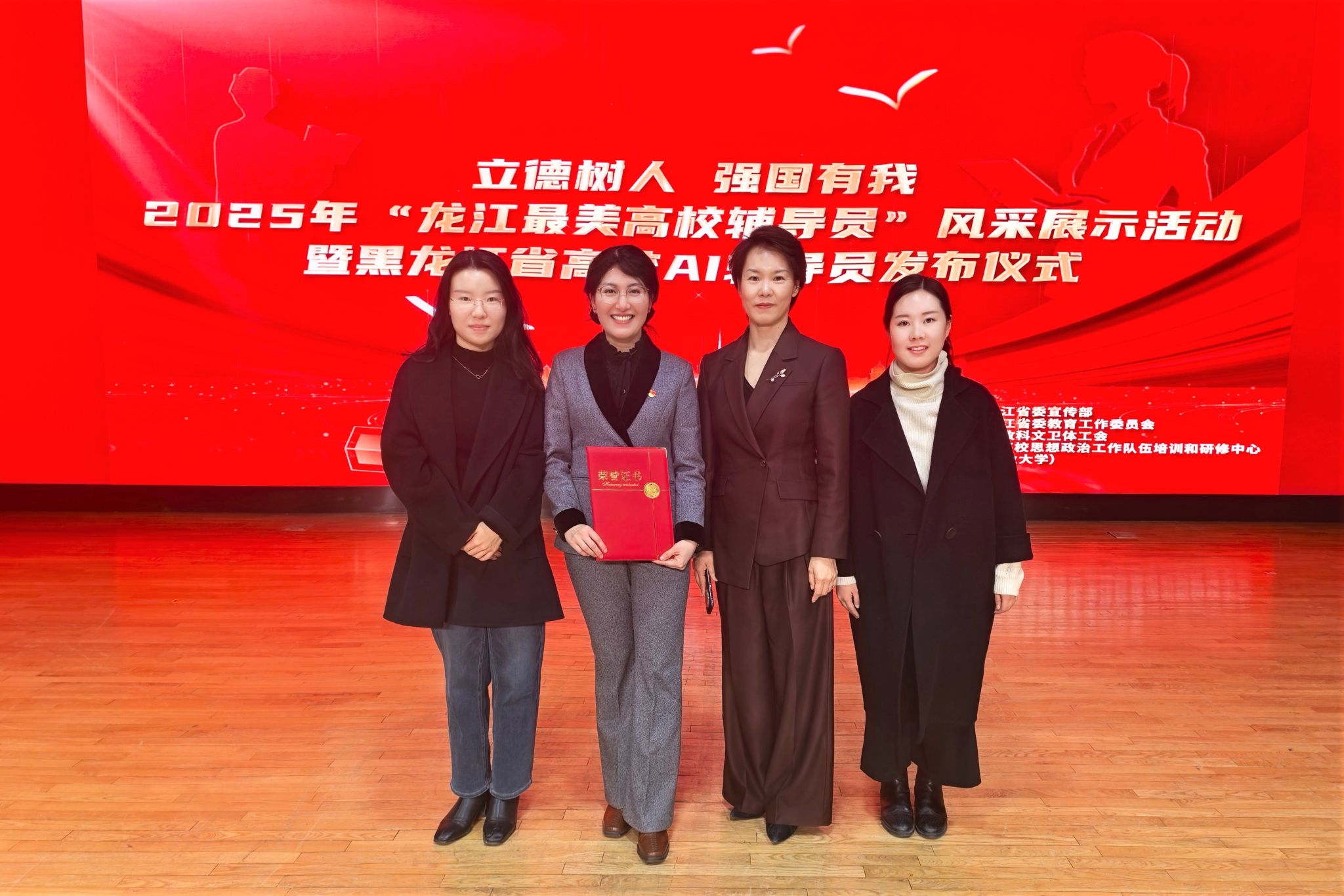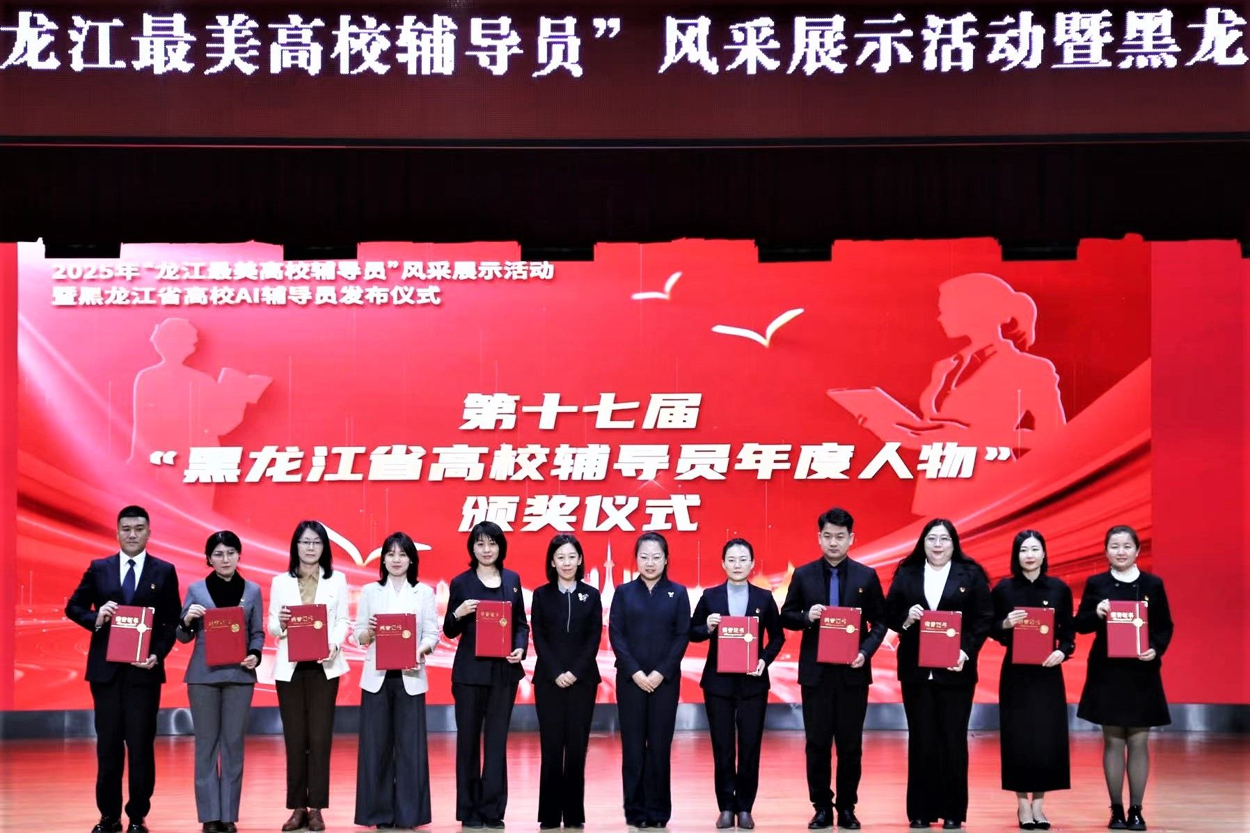 活动现场,第十七届“黑龙江省高校辅导员年度人物”获得者、我校马克思主义学院党委副书记王黎黎上台领奖。