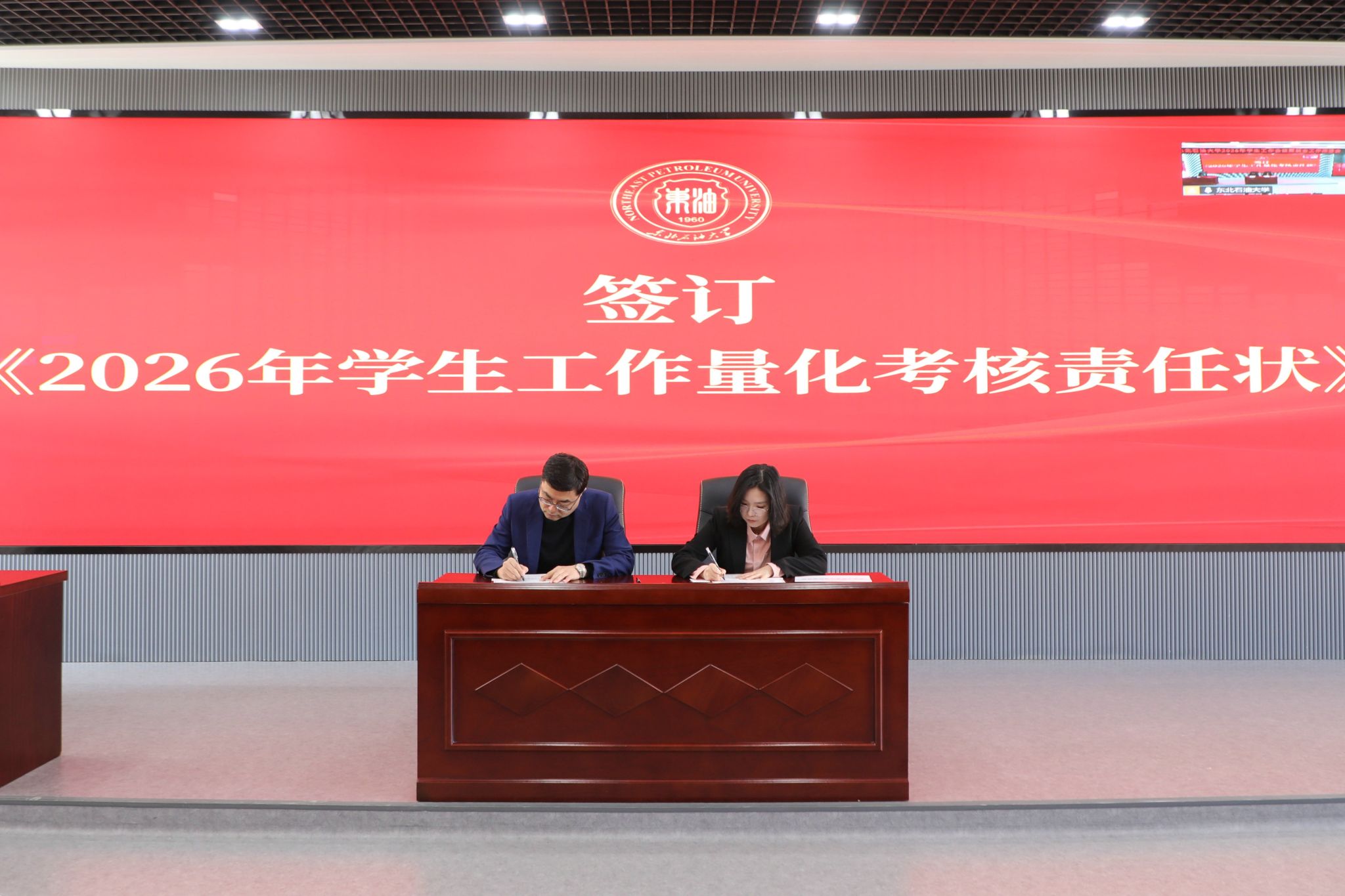 于长青代表学校党委与各学院签订《2026年学生工作量化考核责任状》。