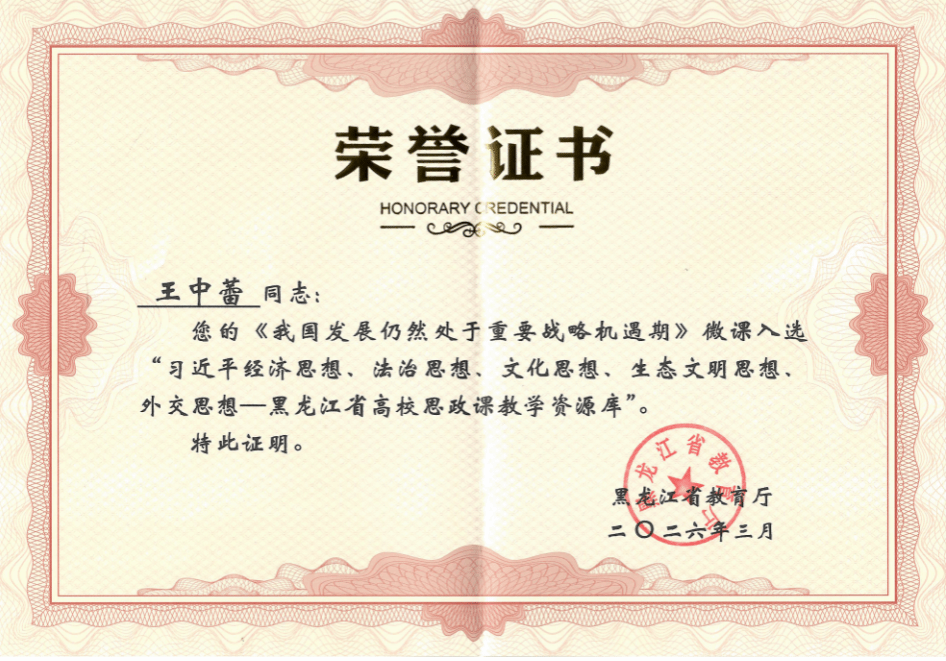 (记者 周宏)近日,黑龙江省教育厅公布最新一批高校思政课教学案例库入选名单。马克思主义学院教师王中蕾、于思琪、张文博主讲的微课《我国发展仍然处于重要战略机遇期》《实施乡村振兴战略》《绿色发展注重解决人与自然和谐共生问题——以北大荒绿色革命为例》入选“习近平经济思想、法治思想、文化思想、生态文明思想、外交思想——黑龙江省高校思政课教学资源库”。