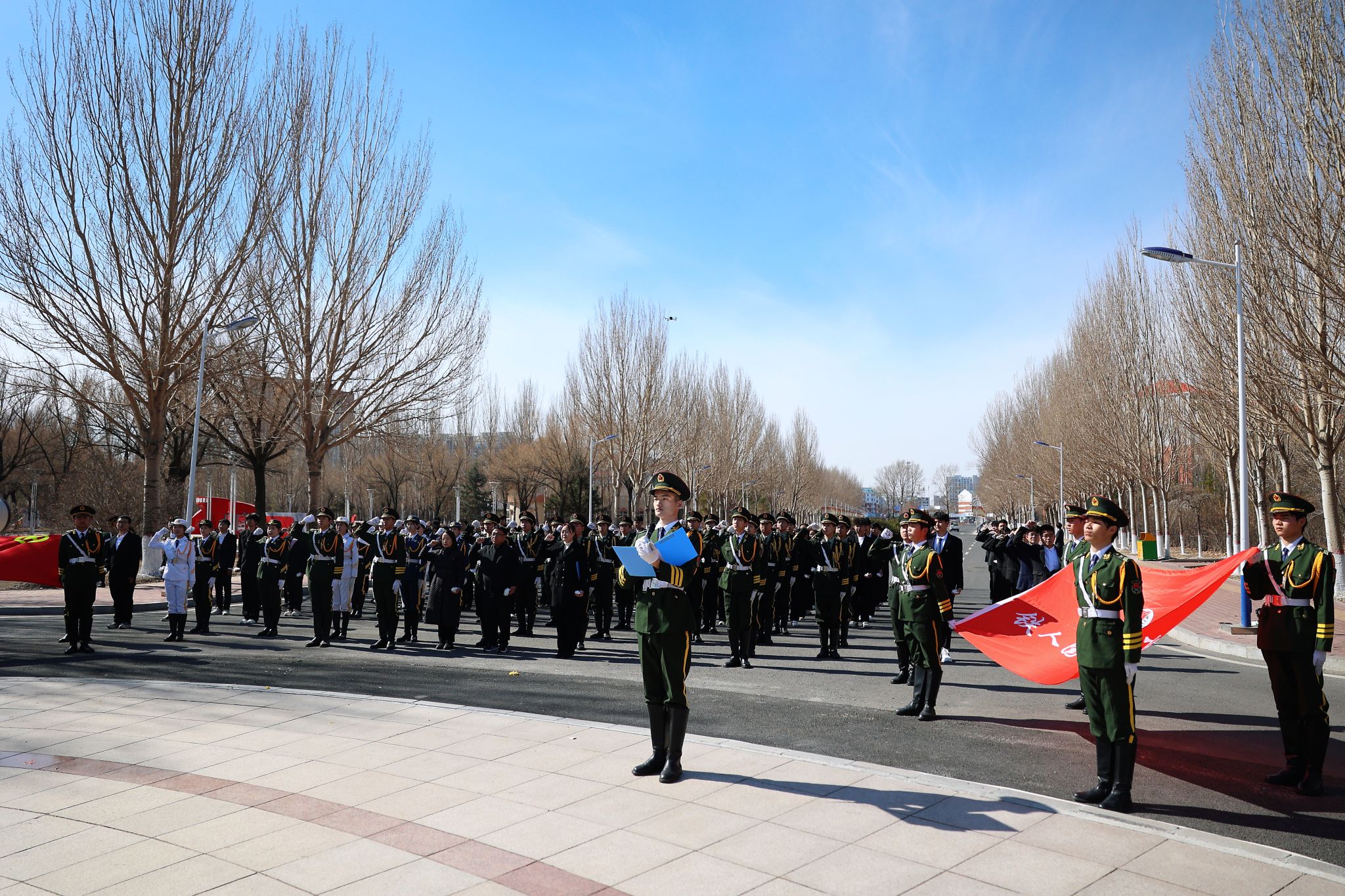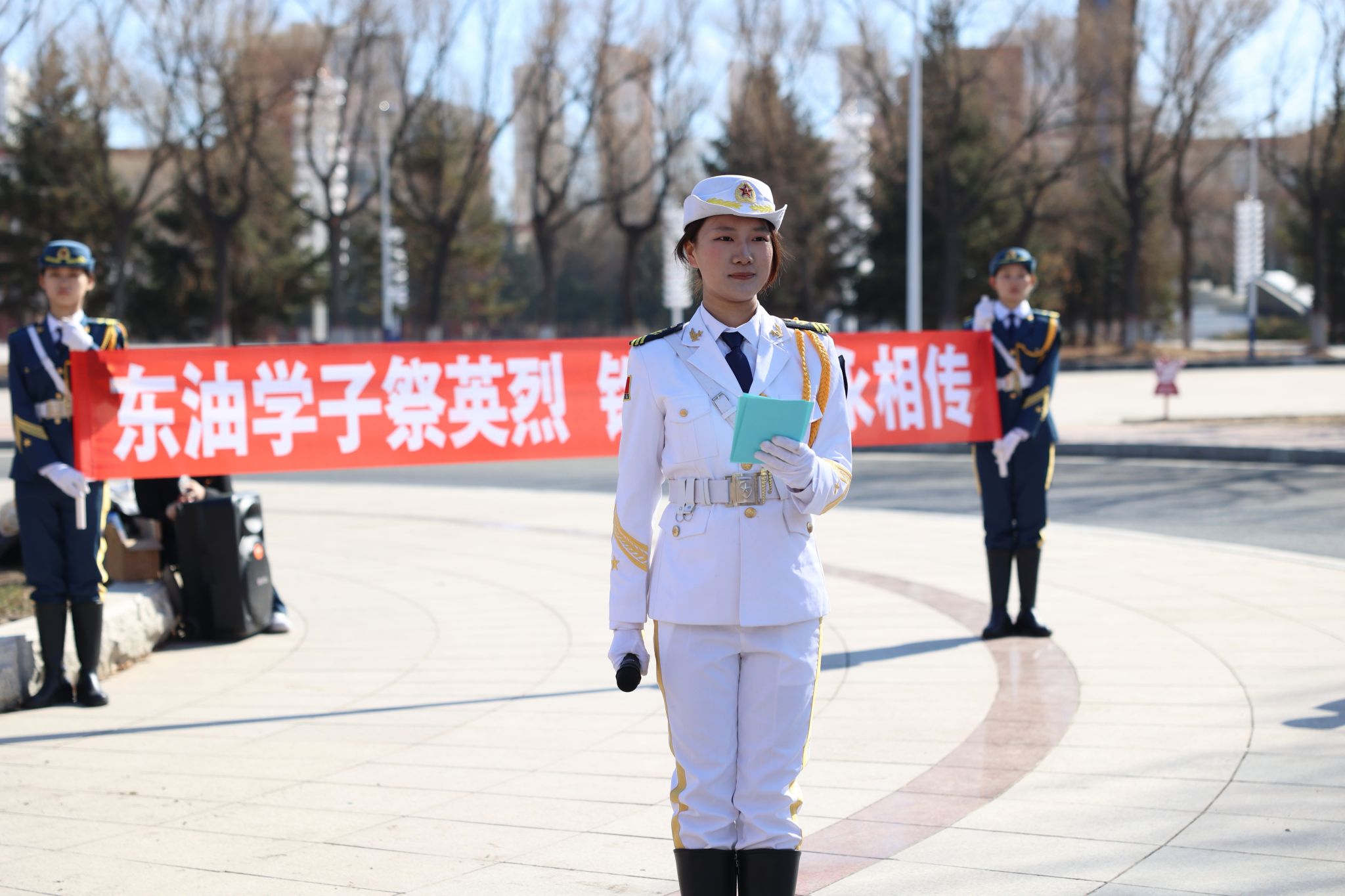 铁人国旗护卫队代表向铁人献词。《铁人队伍永向前》昂扬的旋律响起,前辈的创业精神激励着每一位东油学子不忘初心,能源报国。