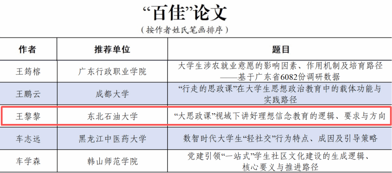 (通讯员 安子怡 记者 周宏)近日,教育部高校思想政治工作队伍培训研修中心(山东大学)、《高校辅导员》编辑部公布了2025年高校思想政治工作优秀文章征集活动评选结果。马克思主义学院党委副书记王黎黎撰写的《“大思政课”视域下讲好理想信念教育的逻辑、要求与方向》入选“百佳”论文,学生工作部学生思想教育科科长赵瑛杰撰写的《寝室“微单元”里的民族团结“大文章”——“石榴籽小屋”育人实践》入选“优秀案例”。