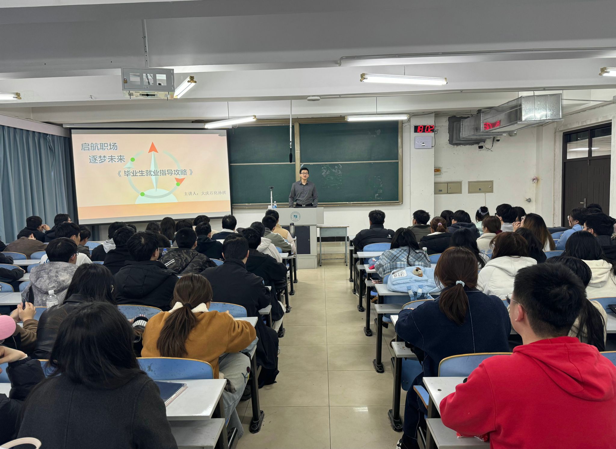 互动环节中,孙祺为学生答疑,详细介绍大庆石化招聘需求,为意向学生提供精准参考。课程内容充实、干货满满,有效明晰了学子职业方向、增强了求职信心。
