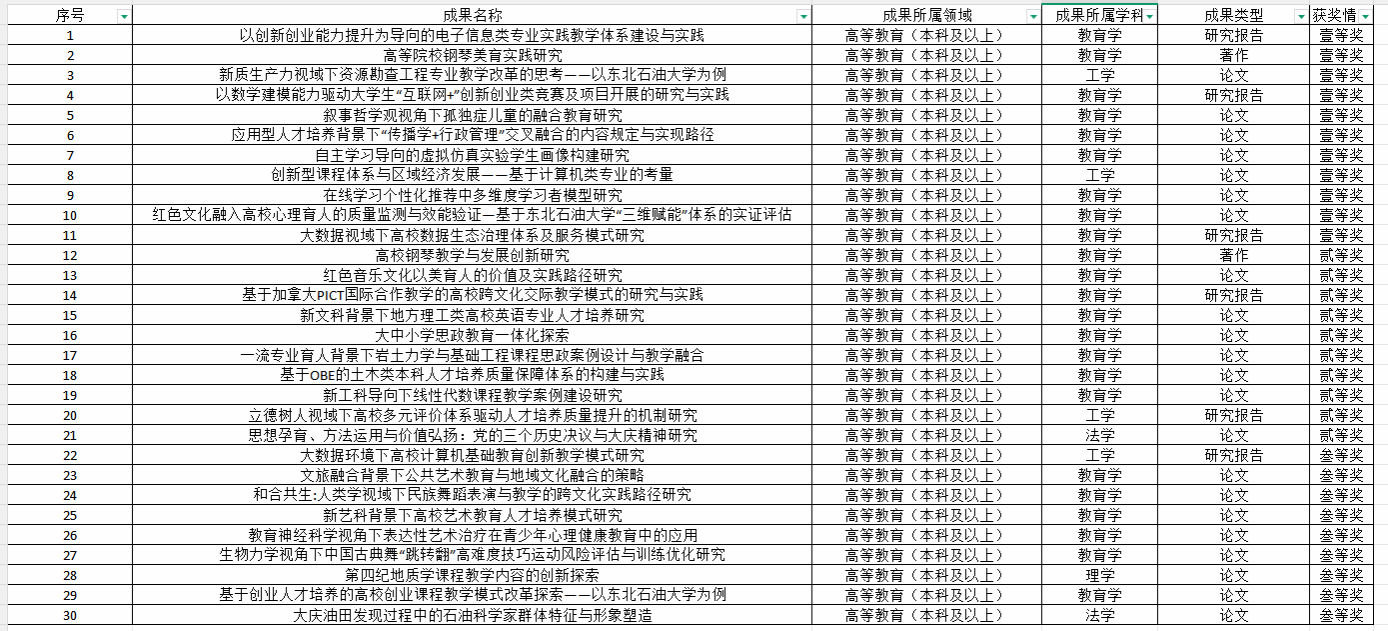 (通讯员 闫莉莎 记者 杨倩倩)近日,黑龙江省教育评估与质量监测学会第二届优秀教育科研成果评选结果公布,我校共有30项成果获奖,整体获奖率达88%,其中一等奖11项、二等奖10项、三等奖9项,各奖项获奖比例均高于全省平均水平。