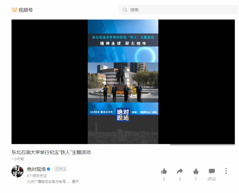 当前位置: 首页 - 媒体聚焦 - 正文 分享 返回 【绝对现场】东北石油大学举行纪念“铁人”主题活动 来源:东北石油大学主站 发布时间:2025-10-09访问次数: 2025年10月9日,绝对现场视频号发布:东北石油大学举行纪念“铁人”主题活动 上一条:【大庆新闻】弘扬大庆精神,凝聚奋进力量 下一条:【微言教育】时光为笔、校史为纸,来看这些校馆如何诠释爱国担当 | 校馆藏古今 一脉爱国情⑥