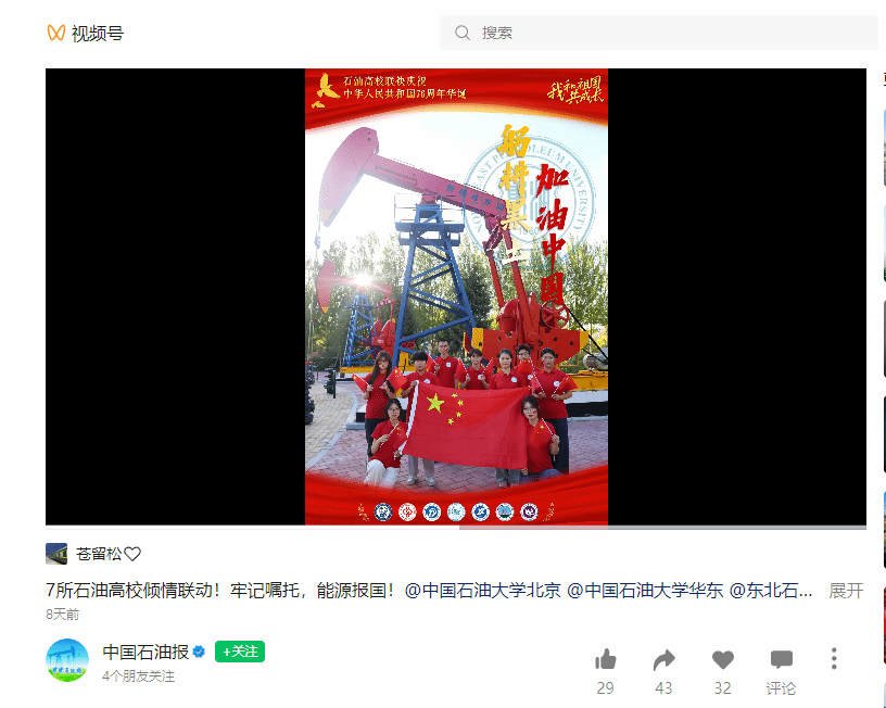 当前位置: 首页 - 媒体聚焦 - 正文 分享 返回 【中国石油报】7所石油高校倾情联动!牢记嘱托,能源报国! 来源:东北石油大学主站 发布时间:2025-10-01访问次数: 2025年10月1日,中国石油报视频号发布:7所石油高校倾情联动!牢记嘱托,能源报国! 上一条: 【中国大学生在线】【石油七校共贺新中国华诞】山河为证,以科技护能源命脉!青春作答,用实干为祖国加油!七所石油高校携手而立,以石油人的赤诚与担当,共同告白祖国!祝中华人民共和国山河无恙,国泰民安! 下一条:【东北网教育】东北石油大学举办第四届新时代石油石化企业党建与思政工作交流会