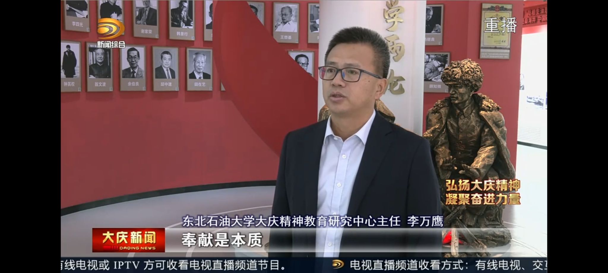 当前位置: 首页 - 媒体聚焦 - 正文 分享 返回 【大庆新闻】弘扬大庆精神,凝聚奋进力量 来源:东北石油大学主站 发布时间:2025-10-09访问次数: 2025年10月8日,大庆新闻报道:弘扬大庆精神,凝聚奋进力量,东北石油大学大庆精神教育研究中心主任李万鹰接受采访 上一条:【大庆日报】遇见“铁人”——穿越时空的对话 下一条:【绝对现场】东北石油大学举行纪念“铁人”主题活动