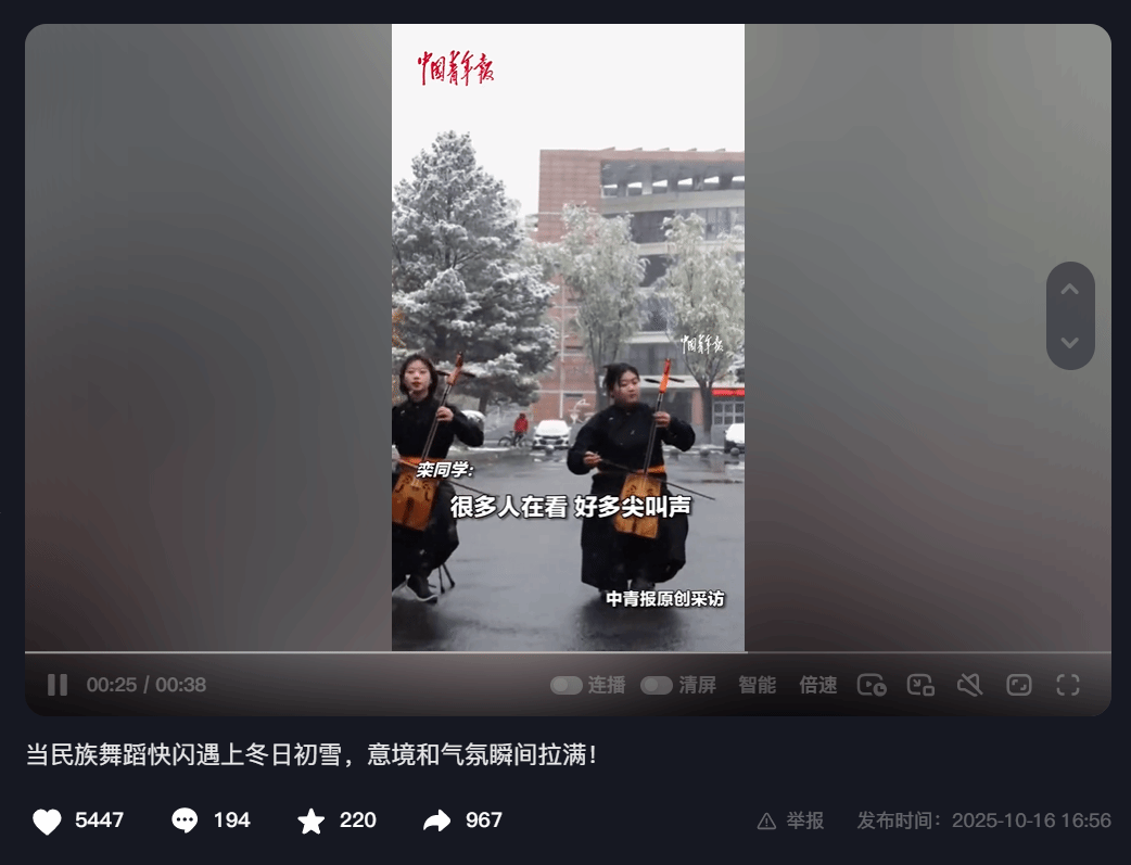当前位置: 首页 - 媒体聚焦 - 正文 分享 返回 【中国青年报】当民族舞蹈快闪遇上冬日初雪,意境和气氛瞬间拉满! 来源:东北石油大学主站 发布时间:2025-10-18访问次数: 2025年10月16日,中国青年报抖音号发布视频:当民族舞蹈快闪遇上冬日初雪,意境和气氛瞬间拉满!视频链接 上一条:【央广网】东北石油大学举办残障人士特殊需求员工座谈会 下一条:【大庆日报】深挖国学素材,破解理工院校思政教育难题 东北石油大学《中庸》课 让经典“走进”青年心