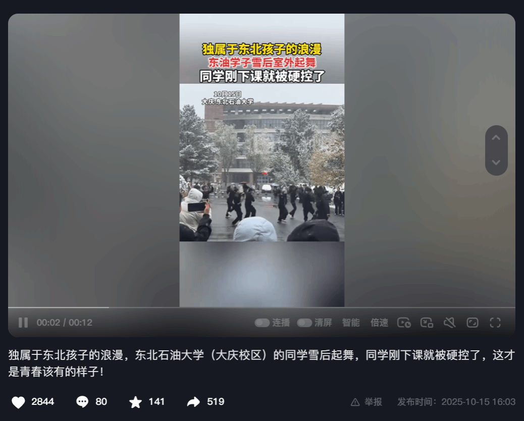 当前位置: 首页 - 媒体聚焦 - 正文 分享 返回 【极光新闻】独属于东北孩子的浪漫,东北石油大学(大庆校区)的同学雪后起舞,同学刚下课就被硬控了,这才是青春该有的样子! 来源:东北石油大学主站 发布时间:2025-10-17访问次数: 2025年10月15日,极光新闻发布抖音号:独属于东北孩子的浪漫,东北石油大学(大庆校区)的同学雪后起舞,同学刚下课就被硬控了,这才是青春该有的样子! 上一条:【大庆日报】深挖国学素材,破解理工院校思政教育难题 东北石油大学《中庸》课 让经典“走进”青年心 下一条:【龙视新闻】下雪季东北又开始上分了!大学生伴着飞舞的雪花翩翩起舞