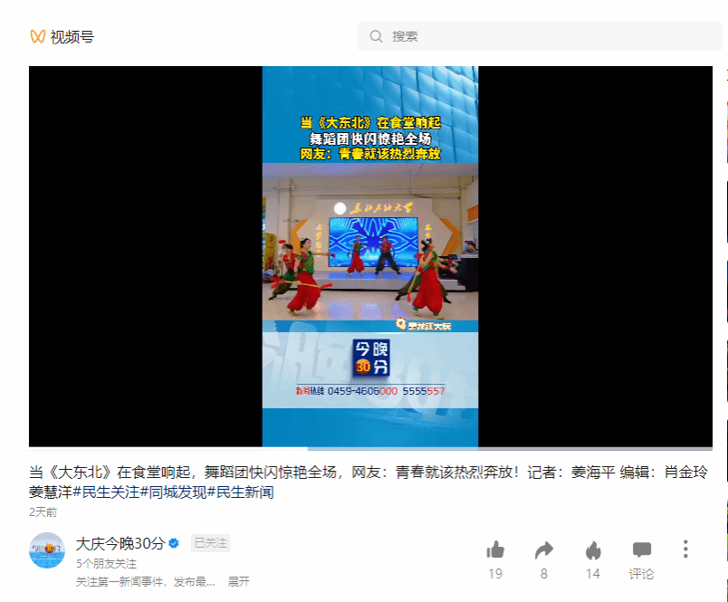 当前位置: 首页 - 媒体聚焦 - 正文 分享 返回 【大庆今晚30分】当《大东北》在食堂响起,舞蹈团快闪惊艳全场,网友:青春就该热烈奔放! 来源:东北石油大学主站 发布时间:2025-10-26访问次数: 2025年10月25日,大庆今晚30分视频号发布视频:当《大东北》在食堂响起,舞蹈团快闪惊艳全场,网友:青春就该热烈奔放! 上一条:【科技日报】鉴往知来 使命如磐 为建设科技强国接续奋斗 ——党的二十届四中全会在科技工作者中引发热烈反响 下一条:【大庆日报】一场“暖心”的集体生日会