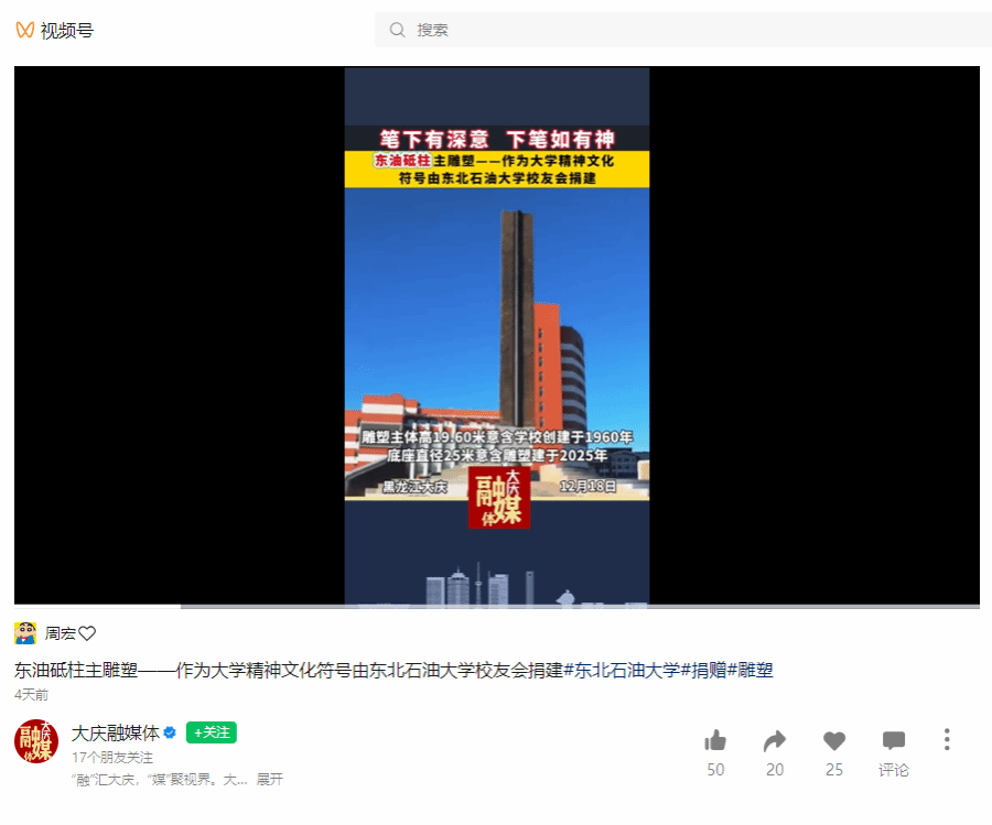 当前位置: 首页 - 媒体聚焦 - 正文 分享 返回 【大庆融媒体】东油砥柱主雕塑——作为大学精神文化符号由东北石油大学校友会捐建 来源:东北石油大学主站 发布时间:2025-12-20访问次数: 2025年12月19日,大庆融媒体视频号发布视频:东油砥柱主雕塑——作为大学精神文化符号由东北石油大学校友会捐建 上一条:【央广网】东北石油大学召开2026年度国家基金申报动员会 下一条:【微大庆】谁说大学生怕冷,来看看冰上运动会的“显眼包”,玩的那叫一个热火朝天!